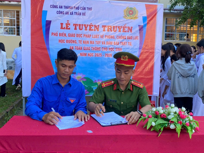 Nhân dịp này, Chi đoàn Công an xã Trần Đề và Đoàn trường đã ký kết Quy chế phối hợp tuyên truyền, giáo dục pháp luật trong năm học 2025 – 2026, góp phần xây dựng môi trường học đường an toàn, lành mạnh. Qua các hoạt động đã giúp học sinh nâng cao nhận thức, hình thành thói quen sống tích cực, tuân thủ pháp luật và biết cách xử lý tình huống khẩn cấp hiệu quả.