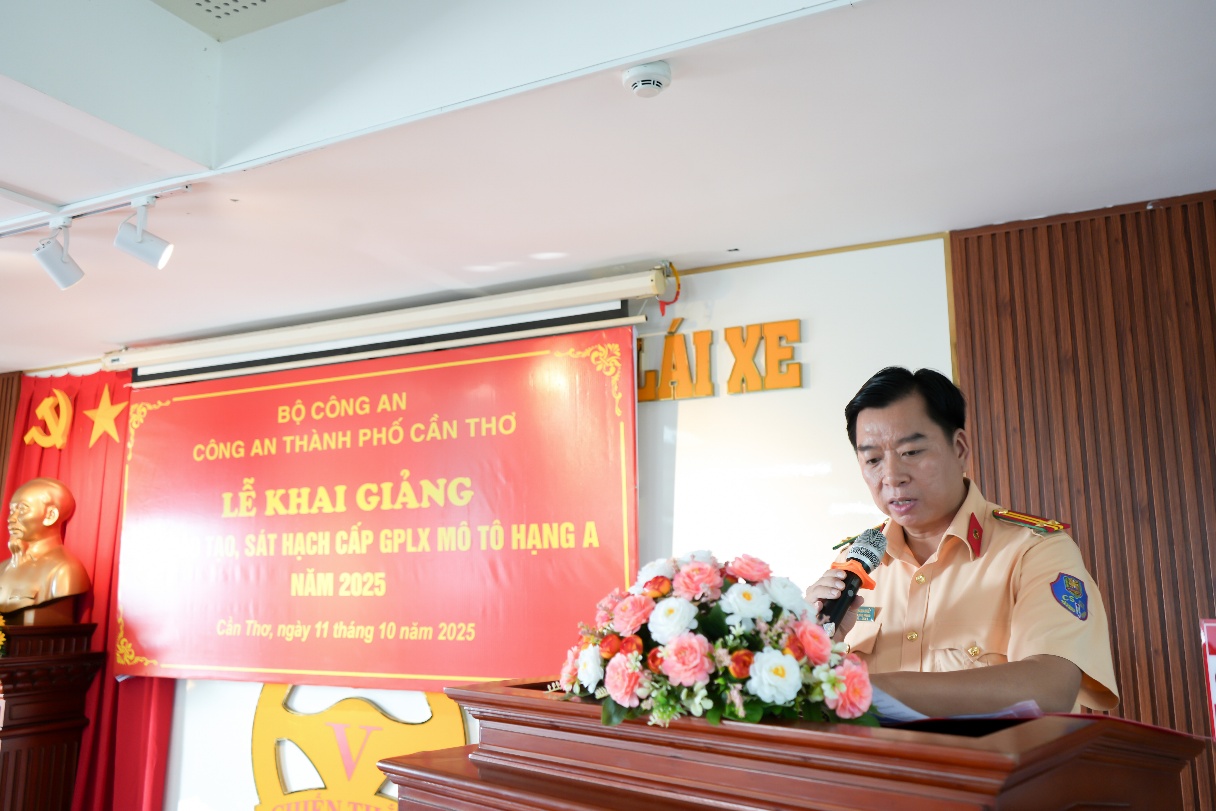 Sáng 11/10/2025, Công an thành phố Cần Thơ phối hợp Trung tâm giáo dục nghề nghiệp, đào tạo và sát hạch lái xe cơ giới đường bộ Chiến Thắng tổ chức Lễ Khai giảng lớp đào tạo, sát hạch, cấp giấy phép lái xe mô tô hạng A trong Công an thành phố. Tham dự có đại diện lãnh đạo Phòng Cảnh sát giao thông, các phòng chức năng trong Công an thành phố; đại diện lãnh đạo Trung tâm giáo dục nghề nghiệp, đào tạo và sát hạch lái xe cơ giới đường bộ Chiến Thắng cùng 134 học viên là sĩ quan, hạ sĩ quan, chiến sĩ nghĩa vụ Công an thành phố.