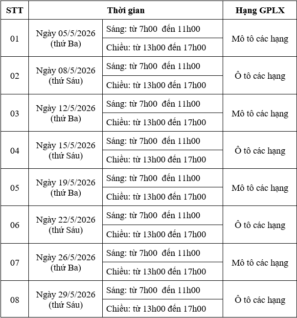 THÔNG BÁO DỰ KIẾN NGÀY KIỂM TRA KIẾN THỨC PHÁP LUẬT VỀ TRẬT TỰ, AN TOÀN GIAO THÔNG ĐƯỜNG BỘ ĐỂ ĐƯỢC PHỤC HỒI ĐIỂM GIẤY PHÉP LÁI XE THÁNG 5/2026