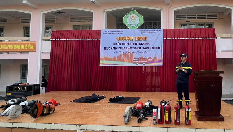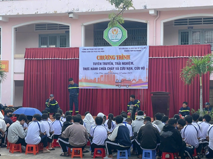 Thực hiện Kế hoạch của Công an thành phố về tổ chức tuyên truyền, trải nghiệm, thực hành chữa cháy và cứu nạn, cứu hộ (PCCC và CNCH), ngày 06/12/2025, Công an phường Vị Thanh phối hợp Phòng Cảnh sát PCCC và CNCH tổ chức buổi tuyên truyền, trải nghiệm, thực hành PCCC và CNCH tại Trường Trung học phổ thông (THPT) Vị Thanh với khoảng 100 cán bộ, giáo viên và học sinh tham dự. Hoạt động nhằm trang bị cho học sinh các kiến thức, kỹ năng cần thiết để chủ động phòng ngừa, ứng phó khi xảy ra sự cố cháy, nổ; nâng cao tinh thần cảnh giác, góp phần xây dựng môi trường học đường an toàn.