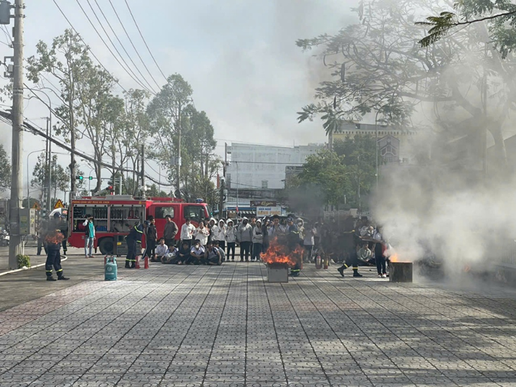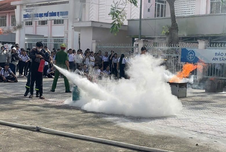 Học sinh Trường THPT Vị Thanh thực hiện kỹ năng sử dụng bình chữa cháy dập tắt đám cháy
