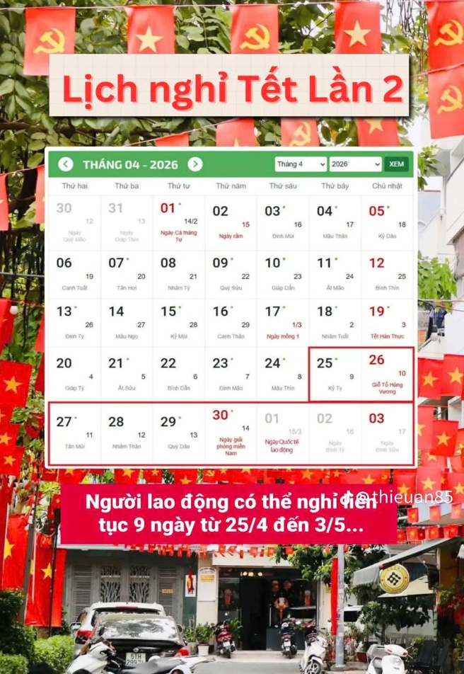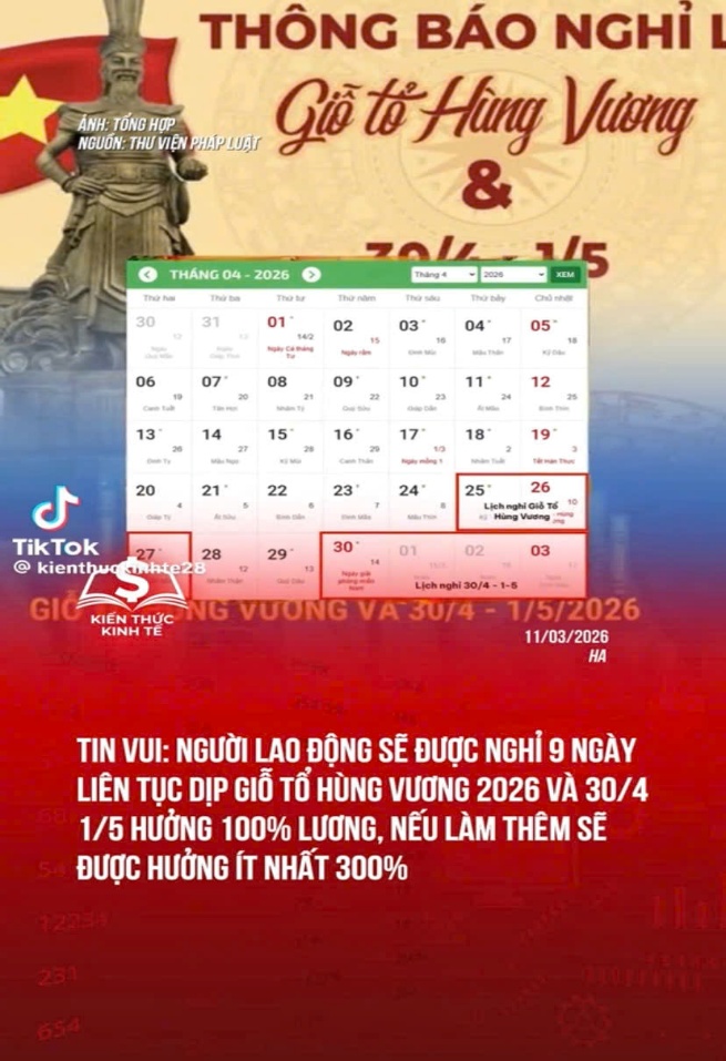 Ngày 10/4/2026, Bộ Nội vụ ban hành Công văn số 3383/BNV-CVL về việc thông tin lịch nghỉ dịp Giỗ Tổ Hùng Vương, Ngày Chiến thắng 30/4 và Ngày Quốc tế Lao động 01/5 năm 2026. Theo đó, Bộ Nội vụ khẳng định không có chủ trương điều chỉnh lịch nghỉ, đồng thời không đề xuất phương án hoán đổi ngày làm việc để kéo dài kỳ nghỉ. Vì vậy, không có việc nghỉ liên tục 09 ngày trong dịp này.