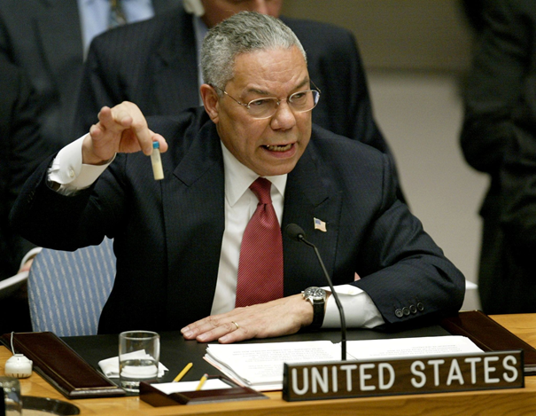 Ảnh: Cựu Ngoại trưởng Mỹ Colin Powell giơ một chiếc lọ được cho là chứa mầm bệnh than tại Hội đồng Bảo an Liên hợp quốc năm 2003 để thuyết phục thế giới về “mối đe dọa” từ Iraq - một bằng chứng giả gây ra hậu quả thật cho cả một dân tộc