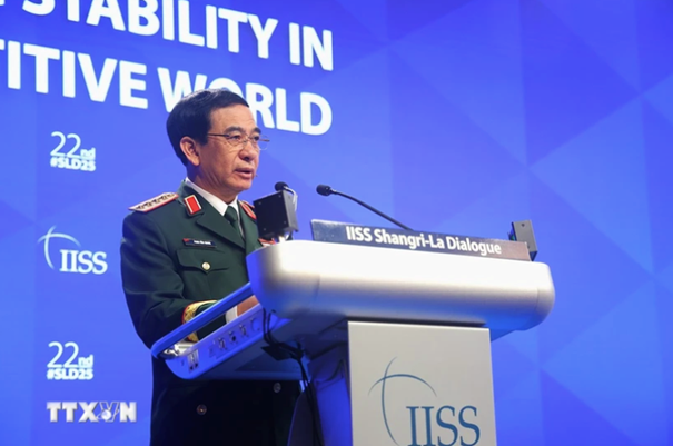 Ảnh: Bộ trưởng Quốc phòng Phan Văn Giang phát biểu tại Đối thoại Shangri-La 2025 nêu rõ Việt Nam nhất quán duy trì chính sách quốc phòng “4 không”