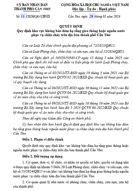 Ngày 28/01/2026, Ủy ban nhân dân thành phố Cần Thơ đã ban hành Quyết định số 11/2026/QĐ-UBND quy định khu vực không bảo đảm hạ tầng giao thông hoặc nguồn nước phục vụ chữa cháy trên địa bàn thành phố Cần Thơ và có hiệu lực từ ngày 28/01/2026. Theo đó, Điều 4 quy định: