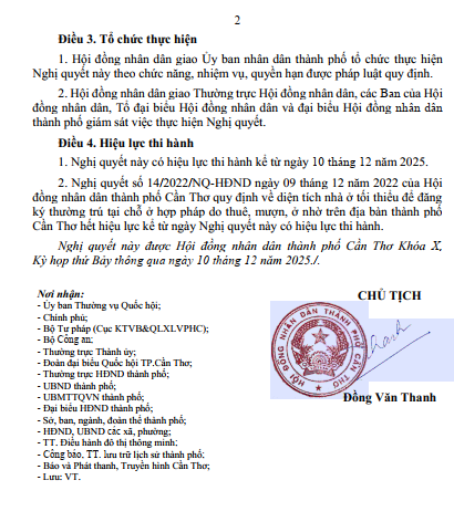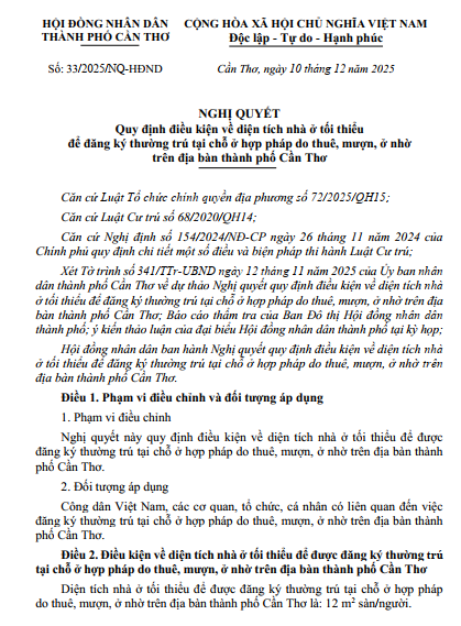 Ngày 10/12/2025, tại Kỳ họp thứ Bảy, Hội đồng nhân dân thành phố Cần Thơ khóa X đã thông qua Nghị quyết số 33/2025/NQ-HĐND quy định điều kiện về diện tích nhà ở tối thiểu để đăng ký thường trú tại chỗ ở hợp pháp do thuê, mượn, ở nhờ trên địa bàn thành phố Cần Thơ và có hiệu lực thi hành kể từ ngày 10/12/2025, theo đó, diện tích nhà ở tối thiểu để được đăng ký thường trú tại chỗ ở hợp pháp do thuê, mượn, ở nhờ trên địa bàn thành phố Cần Thơ là: 12 m2 sàn/người. Đồng thời, Nghị quyết số 14/2022/NQ-HĐND ngày 09 tháng 12 năm 2022 của Hội đồng nhân dân thành phố Cần Thơ quy định về diện tích nhà ở tối thiểu để đăng ký thường trú tại chỗ ở hợp pháp do thuê, mượn, ở nhờ trên địa bàn thành phố Cần Thơ hết hiệu lực kể từ ngày Nghị quyết này có hiệu lực thi hành. Cổng thông tin điện tử Công an thành phố đăng tải toàn văn Nghị quyết nêu trên để tổ chức, cá nhân biết, thực hiện./.