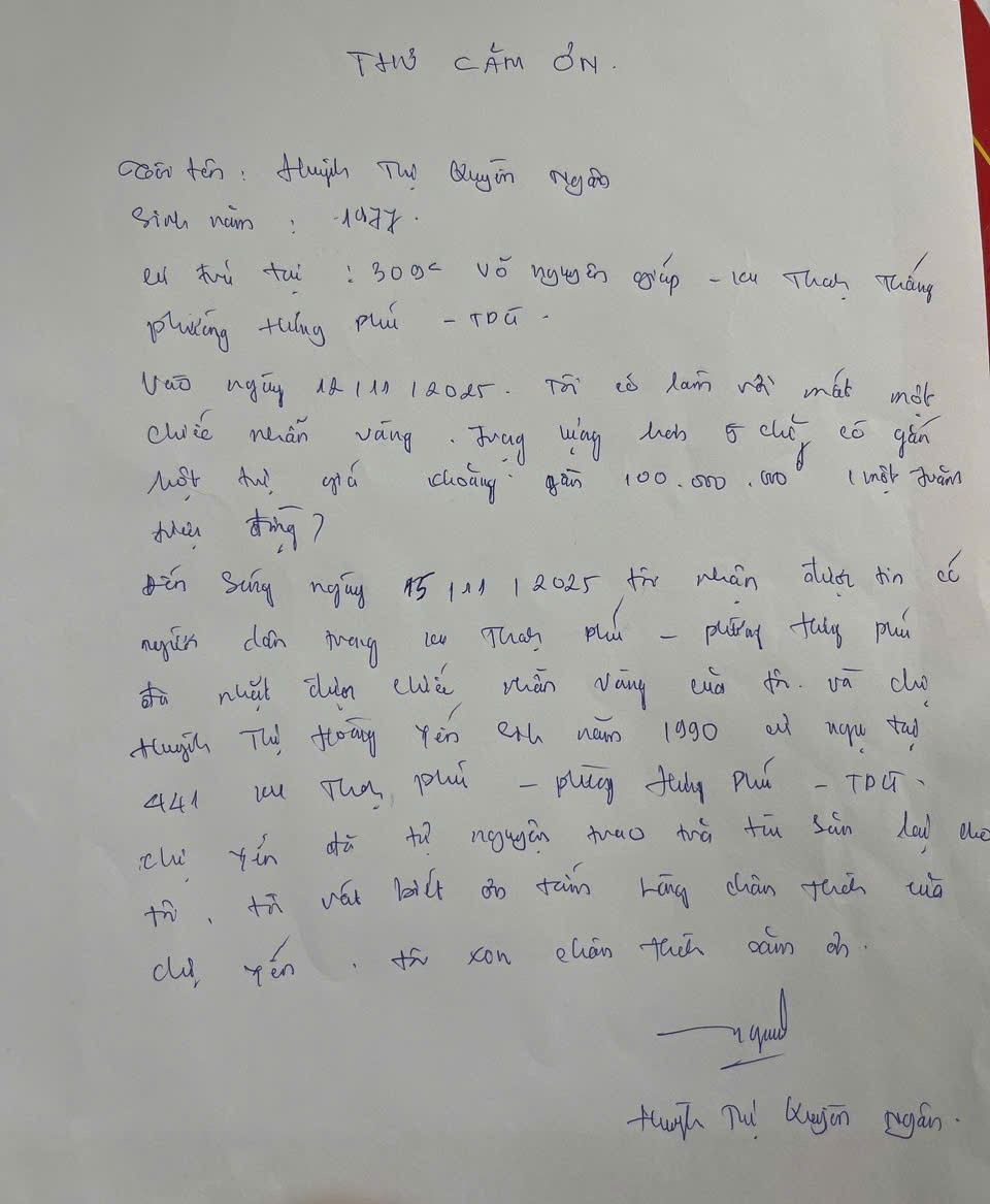 Theo đó, ngày 16/11/2025, chị Huỳnh Thị Hoàng Yến, sinh năm 1990, thường trú 441, khu vực Thạnh Phú, phường Hưng Phú thông báo trong lúc đi tập thể dục, chị nhặt được một chiếc nhẫn vàng tại khu vực Thạnh Thắng, phường Hưng Phú. Nhận được thông tin, Đại úy Phạm Bá Tài, Cảnh sát khu vực Thạnh Phú, đã báo cáo Ban chỉ huy Công an phường và phối hợp xác minh, nắm tình hình trên địa bàn để tìm trả lại tài sản cho người bị mất. Ngay trong buổi sáng cùng ngày, đơn vị đã xác định chủ sở hữu chiếc nhẫn là chị Huỳnh Thị Quyền Ngân, sinh năm 1977, thường trú 309C, đường Võ Nguyên Giáp, khu vực Thạnh Thắng, phường Hưng Phú. Sau khi xác minh thông tin, Đại úy Phạm Bá Tài đã liên hệ Ban nhân dân khu vực và gia đình chị Ngân đến nhà chị Yến để nhận lại tài sản.