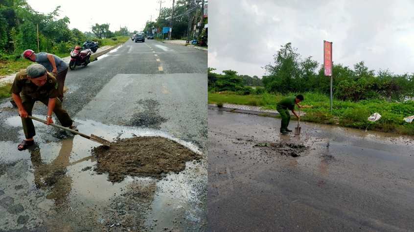 Cảnh sát khu vực phường An Bình hỗ trợ vá đường tại khu vực Mỹ Ái