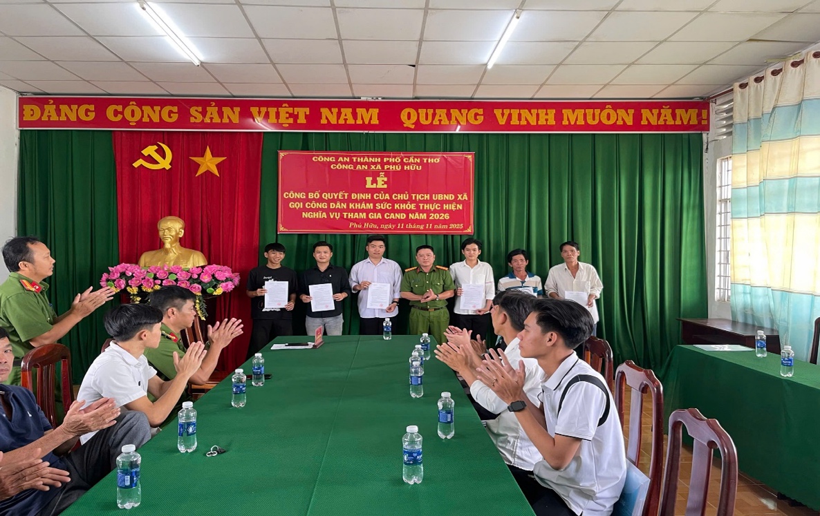 Về công tác tuyển chọn công dân thực hiện nghĩa vụ Công an nhân dân, Công an xã Phú Hữu tổ chức trao quyết định gọi 22 thanh niên tham gia khám sức khỏe thực hiện nghĩa vụ Công an nhân dân năm 2026, hướng dẫn chuẩn bị để đạt kết quả tốt. Công an xã Thới Lai phát động phong trào thi đua với chủ đề “Công an xã Thới Lai quyết tâm thực hiện thắng lợi công tác tuyển chọn công dân thực hiện nghĩa vụ Công an nhân dân năm 2026”, triển khai đồng bộ các biện pháp tạo nguồn, tuyên truyền, vận động thanh niên và gia đình, phối hợp với Ban Chỉ huy Quân sự, Đoàn thanh niên, các ban ngành, đoàn thể và ấp trên địa bàn. Nhờ đó, đã vận động 43 thanh niên đăng ký tham gia, trong đó 36 thanh niên đủ điều kiện khám sức khỏe, vượt chỉ tiêu 18 người. Phong trào thi đua tạo khí thế sôi nổi, nâng cao tinh thần trách nhiệm, chủ động, sáng tạo, lan tỏa niềm tin và tự hào của nhân dân, góp phần hoàn thành xuất sắc nhiệm vụ tuyển chọn công dân và xây dựng lực lượng Công an vững mạnh. Công an xã Vĩnh Thạnh đã tiếp nhận 35 hồ sơ, trong đó 20 thanh niên đạt yêu cầu sức khỏe sơ tuyển; đến nay tiếp tục vận động thêm 10 thanh niên, nâng tổng số lên 30 thanh niên tự nguyện đăng ký thực hiện nghĩa vụ Công an nhân dân năm 2026 (gồm 02 đại học, 02 cao đẳng và 26 trung học phổ thông), tất cả đều là đoàn viên ưu tú, góp phần hoàn thành chỉ tiêu tuyển quân và lan tỏa tinh thần xung kích của thanh niên địa phương.