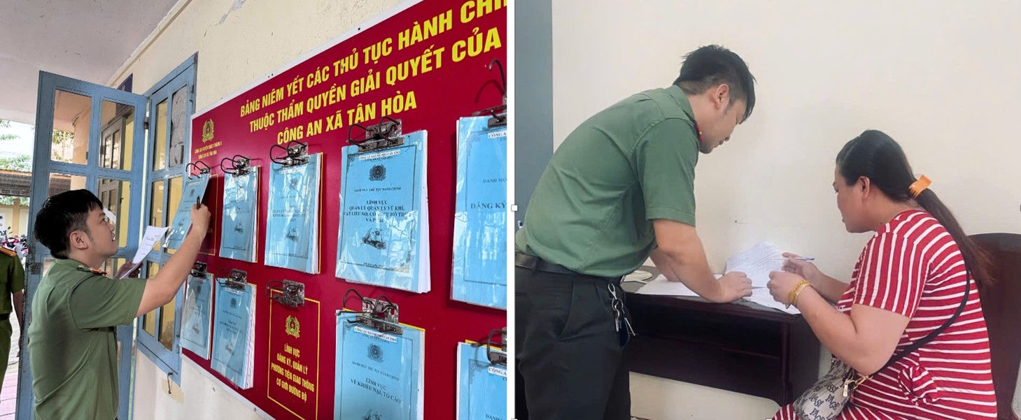 Công an xã Tân Hoà niêm yết thủ tục hành chính mới và hướng dẫn người dân điền Đơn đề nghị xác nhận, cung cấp thông tin.