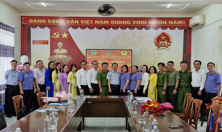 Lãnh đạo cùng các thí sinh thuộc các đơn vị Viện Kiểm sát nhân dân khu vực 6, Tòa án nhân dân khu vực 6, Công an xã Phú Tâm chụp ảnh lưu niệm tại buổi giao lưu văn nghệ.