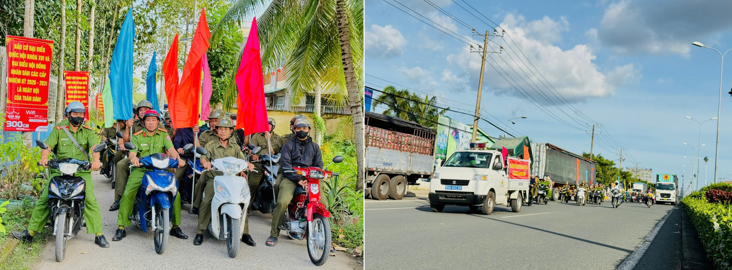 Hình ảnh diễu hành biểu dương lực lượng trên một số tuyến đường tại địa bàn xã Thới Lai.