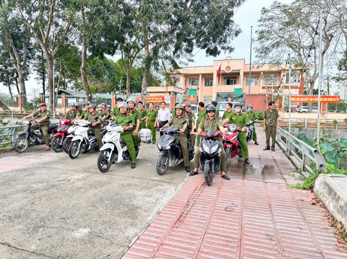 Lực lượng Công an xã Thạnh Thới An cùng các lực lượng ra quân trên các tuyến đường.