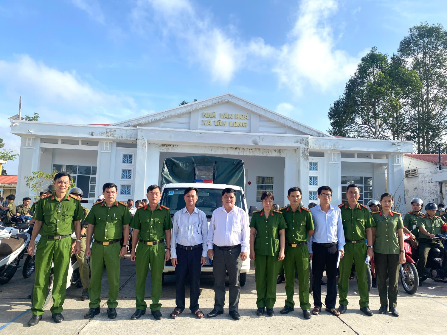 Lãnh đạo chính quyền địa phương và chỉ huy Công an xã chụp ảnh lưu niệm trong buổi ra quân tại xã Tân Long
