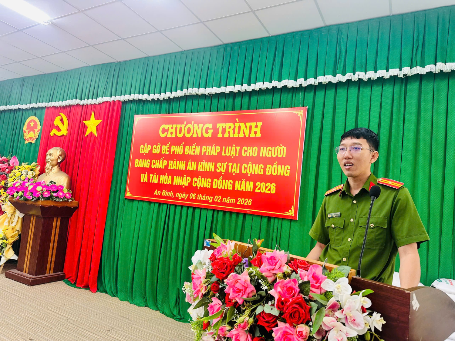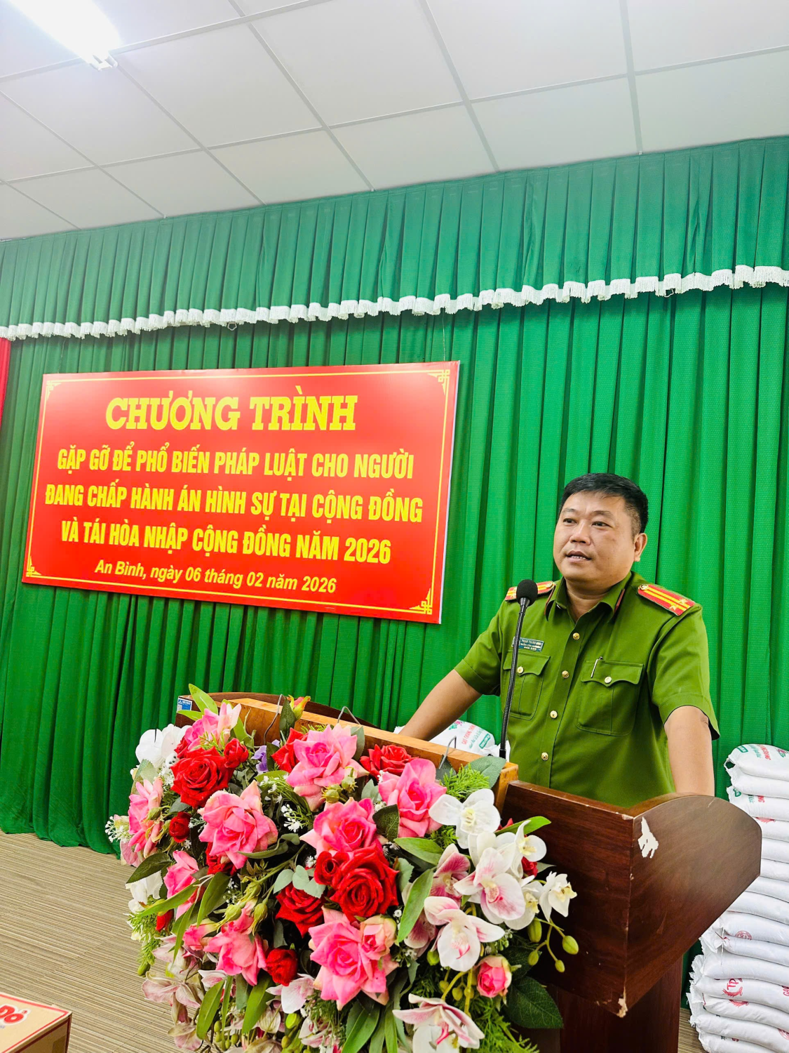 Nhân dịp Tết Nguyên đán Bính Ngọ năm 2026, thực hiện chủ trương của Đảng, chính sách pháp luật của Nhà nước về công tác quản lý, giáo dục người chấp hành án hình sự tại cộng đồng và hỗ trợ tái hòa nhập cộng đồng. Công an phường An Bình tổ chức buổi gặp gỡ, phổ biến pháp luật cho người đang chấp hành án hình sự tại cộng đồng và người đã chấp hành xong án phạt tù trở về cư trú trên địa bàn, đồng thời trao quà Tết động viên người chấp hành án hình sự tại cộng đồng và hỗ trợ tái hòa nhập cộng đồng.