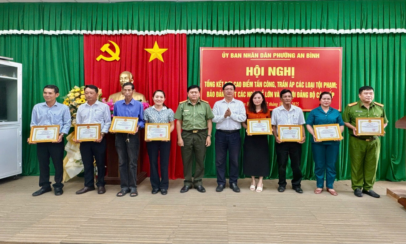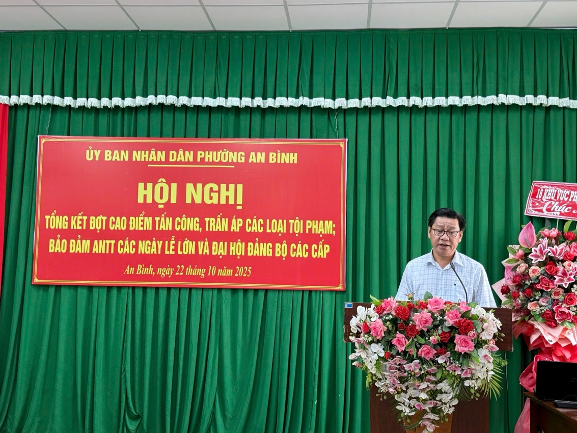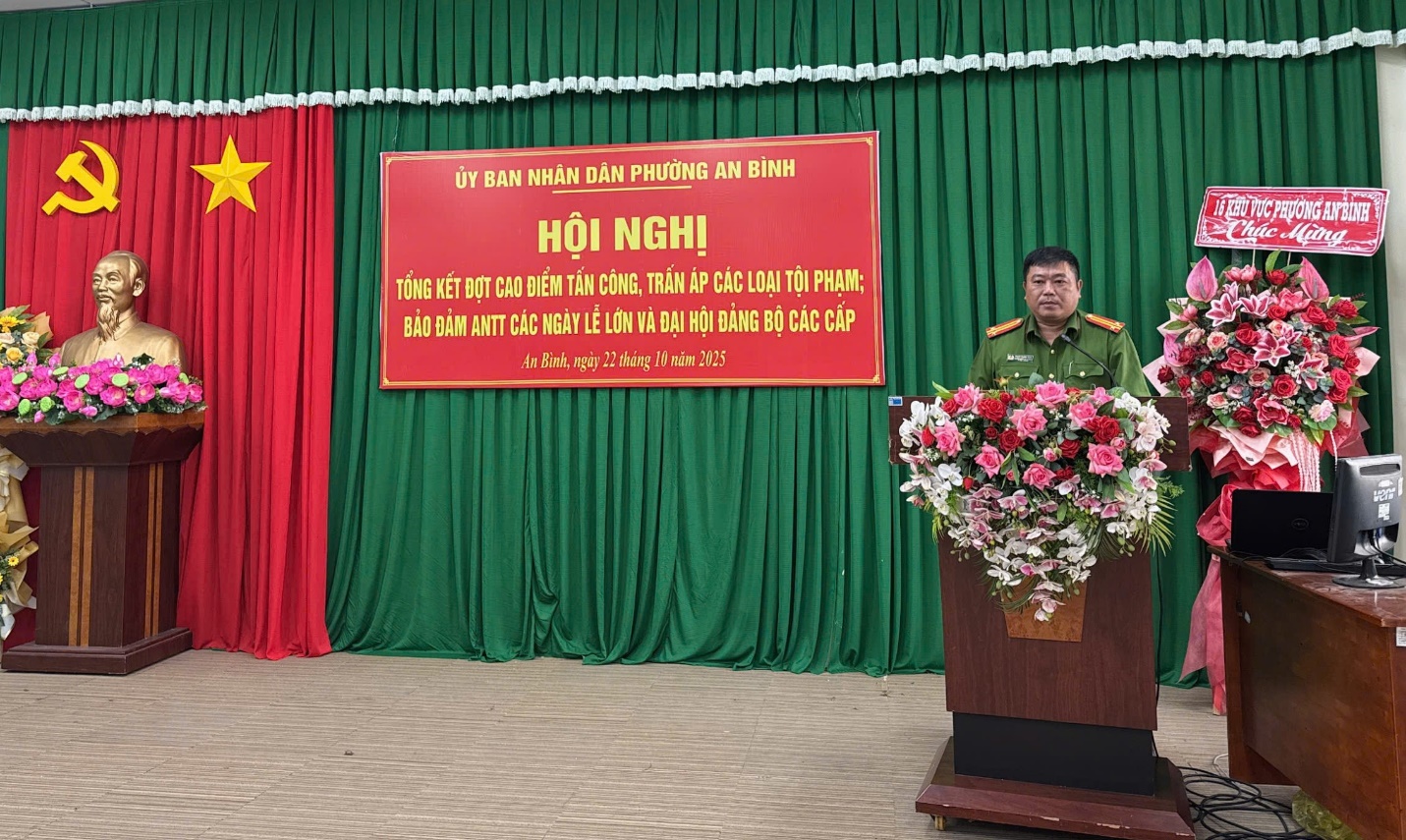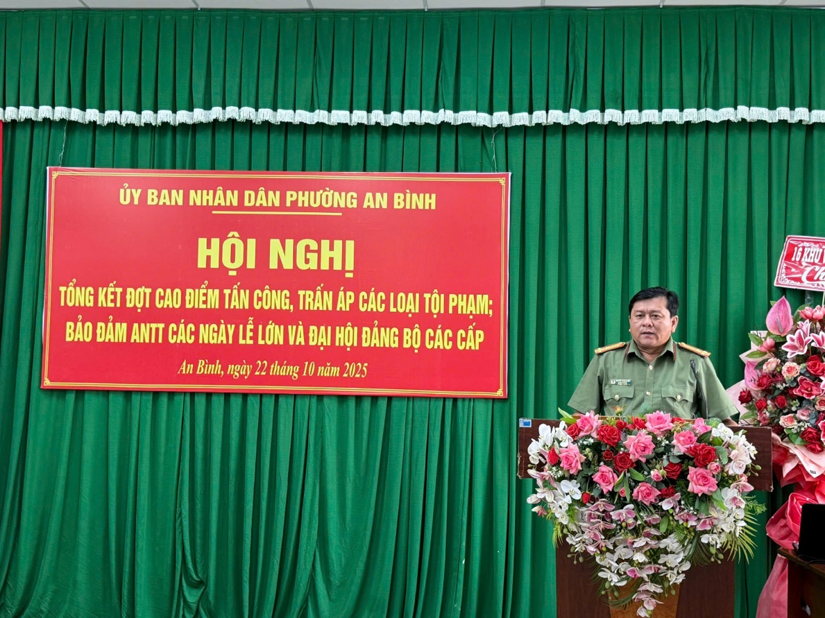 Ngày 22/10/2025, Công an phường An Bình tổ chức Hội nghị tổng kết cao điểm tấn công, trấn áp tội phạm; bảo đảm an ninh, trật tự các ngày lễ lớn và Đại hội Đảng các cấp.