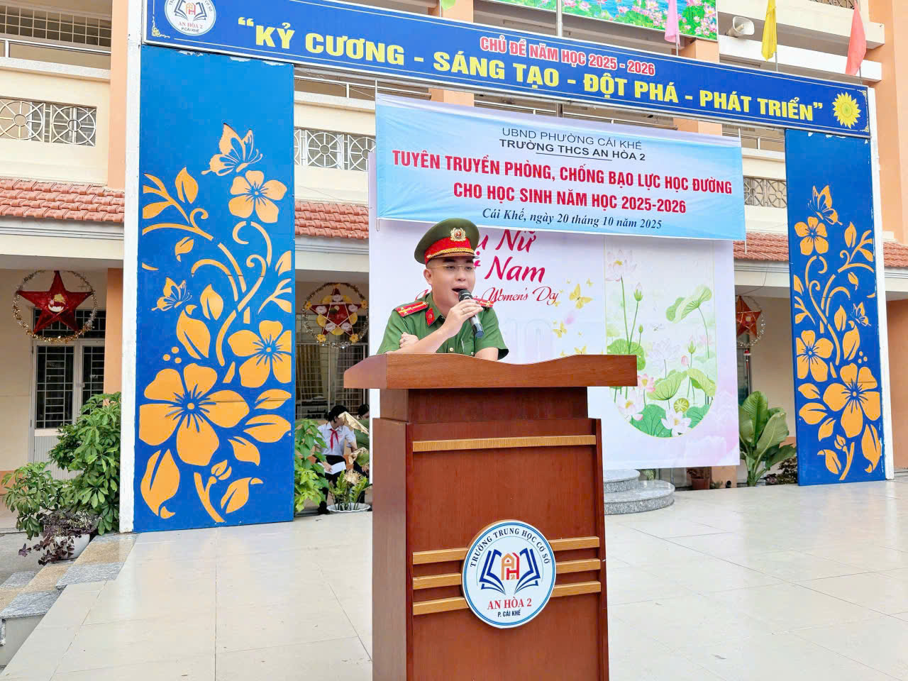 Ngày 20/10/2025, Công an phường Cái Khế tổ chức tuyên truyền phòng chống bạo lực học đường tại Trường Trung học cơ sở An Hoà 2, phường Cái Khế, hoạt động thu hút hơn 600 học sinh và giáo viên tham dự.