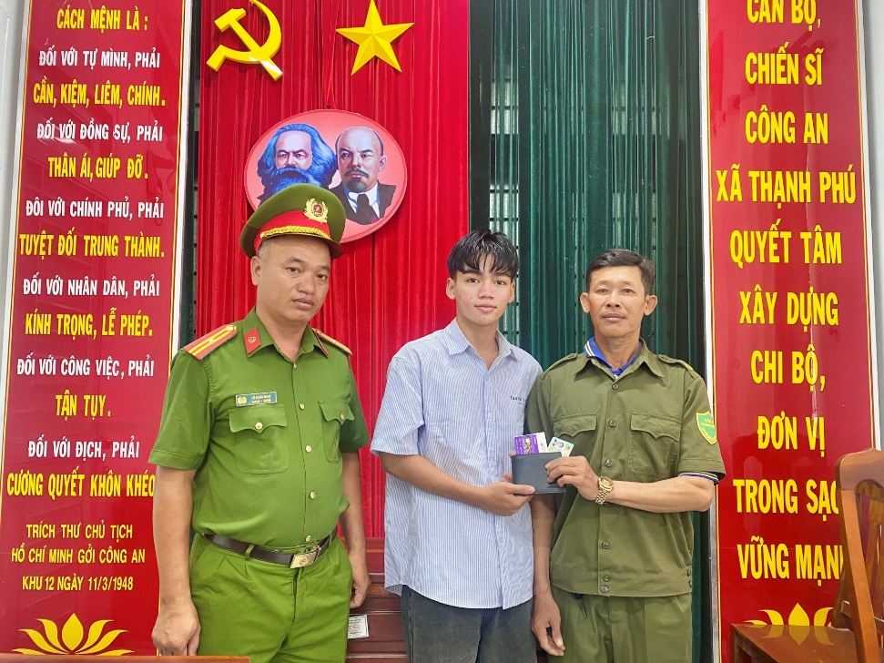 Trước đó, vào ngày 27/9/2025, đồng chí Lê Văn Phiên, lực lượng tham gia bảo vệ an ninh, trật tự ấp An Thạnh, xã Thạnh Phú đã nhặt được 01 ví da trên tuyến đường 921, ấp Phước Trung, xã Thạnh Phú (khu vực gần chùa Hoà Phú Tự). Bên trong ví có 01 giấy chứng nhận đăng ký xe mô tô, 01 thẻ căn cước công dân và 01 thẻ ngân hàng. Ngay sau khi nhặt được, anh Lê Văn Phiên đã đến Công an xã Thạnh Phú để trình báo và bàn giao toàn bộ tài sản.