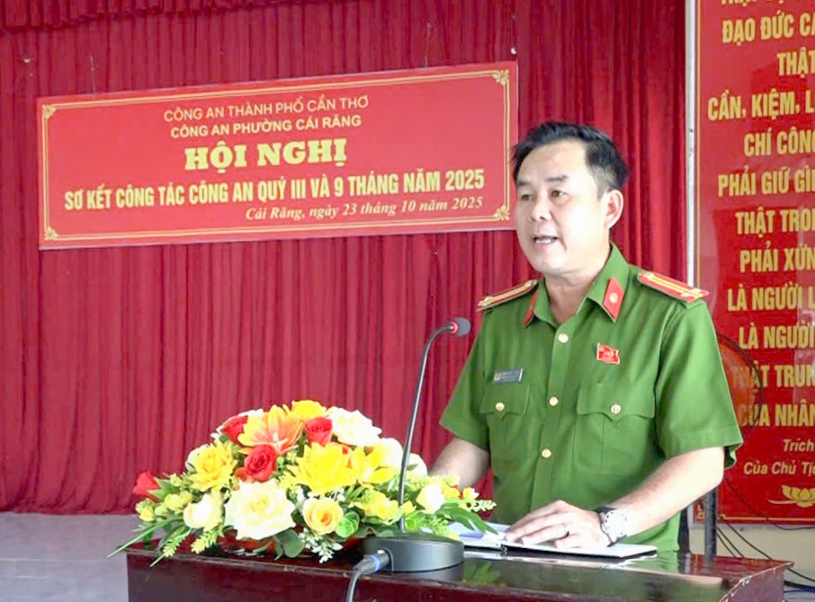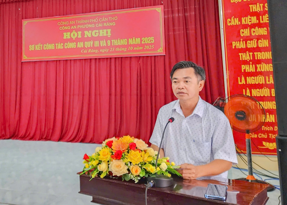 Ngày 23/10/2025, Công an phường Cái Răng tổ chức Hội nghị sơ kết công tác công an quý III và 9 tháng năm 2025. Dự và chủ trì Hội nghị có đồng chí Trần Hải Long, Bí thư Đảng ủy, Chủ tịch HĐND phường; đồng chí Vương Công Khanh, Phó Bí thư Đảng ủy, Chủ tịch UBND phường Cái Răng. Cùng dự có đại diện các đơn vị nghiệp vụ, đại diện các ban, ngành, đoàn thể phường, bí thư chi bộ, trưởng các khu vực dân cư và tập thể cán bộ, chiến sĩ Công an phường Cái Răng.