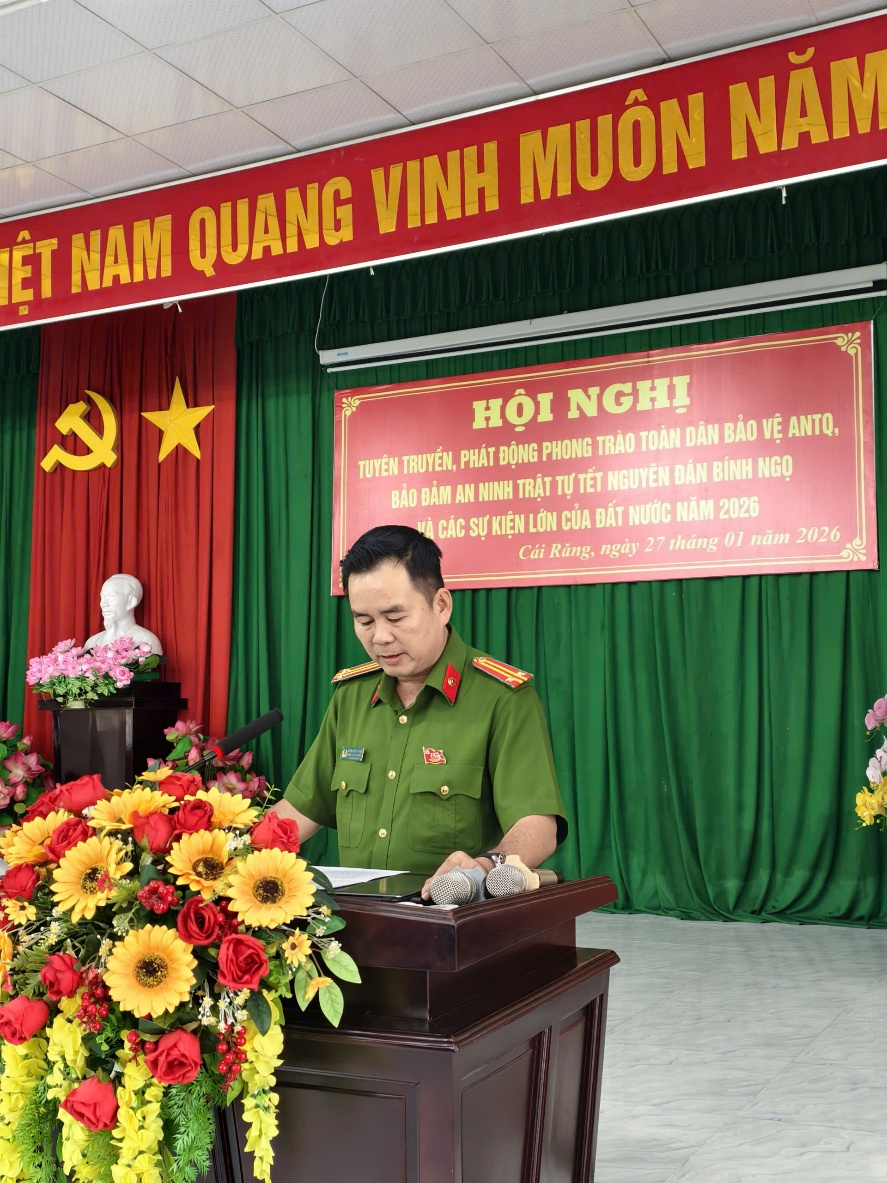 Công an phường Cái Răng vừa tổ chức Hội nghị tuyên truyền, phát động phong trào Toàn dân bảo vệ an ninh Tổ quốc gắn với cao điểm bảo đảm an ninh, trật tự Tết Nguyên đán Bính Ngọ và các sự kiện chính trị quan trọng của đất nước năm 2026. Hội nghị là hoạt động thiết thực nhằm khơi dậy tinh thần đoàn kết, nâng cao ý thức trách nhiệm của cả hệ thống chính trị và Nhân dân trong công tác giữ gìn an ninh, trật tự ngay từ cơ sở.