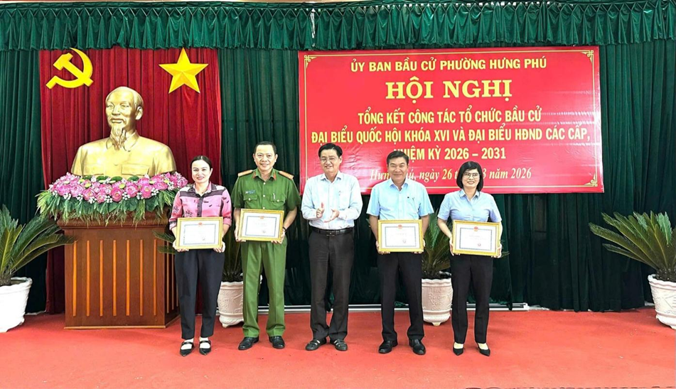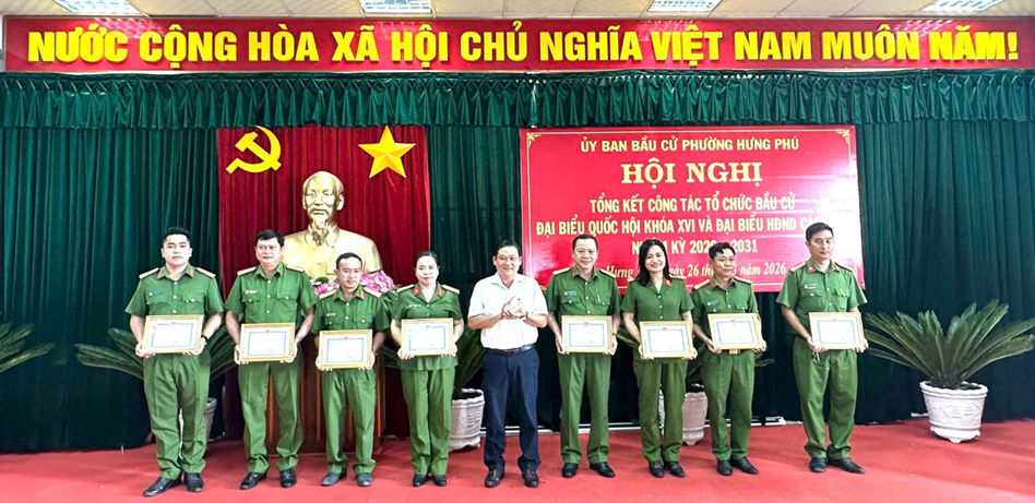 Với tinh thần chủ động, trách nhiệm, Công an phường Hưng Phú đã hoàn thành xuất sắc nhiệm vụ đảm bảo an ninh, an toàn cuộc bầu cử đại biểu Quốc hội khóa XVI và Hội đồng nhân dân các cấp nhiệm kỳ 2026-2031. Tập thể Công an phường vinh dự được Chủ tịch Ủy ban nhân dân phường Hưng Phú tặng giấy khen cho tập thể và 12 cá nhân có thành tích xuất sắc trong công tác bầu cử đại biểu Quốc hội khóa XVI và đại biểu Hội đồng nhân dân các cấp nhiệm kỳ 2026-2031 nhân dịp Hội nghị Tổng kết Công tác tổ chức bầu cử vào ngày 26 tháng 3 năm 2026 tại Ủy ban nhân dân phường Hưng Phú.