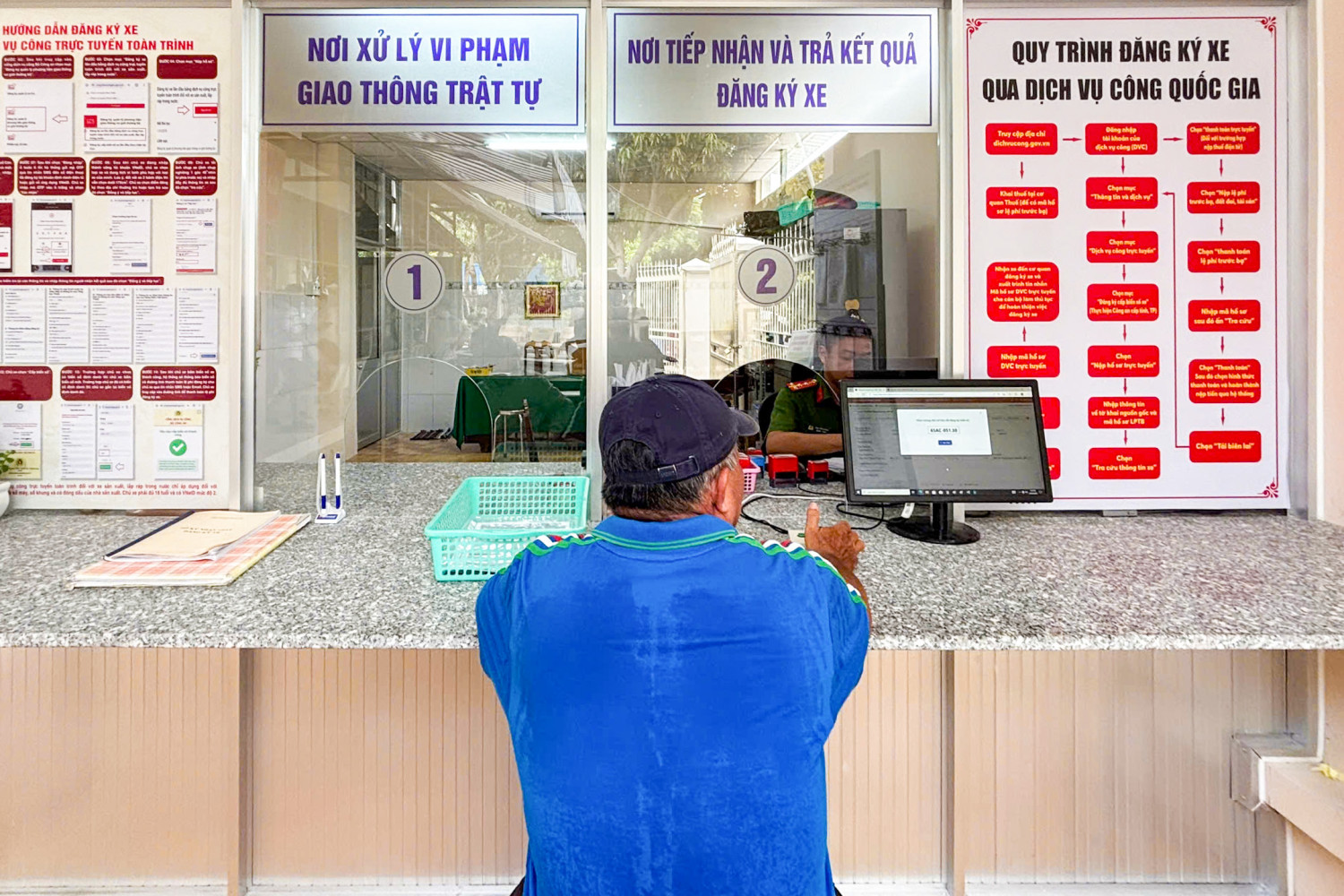 Cán bộ Công an phường Hưng Phú tiếp nhận, hướng dẫn người dân thực hiện thủ tục đăng ký xe