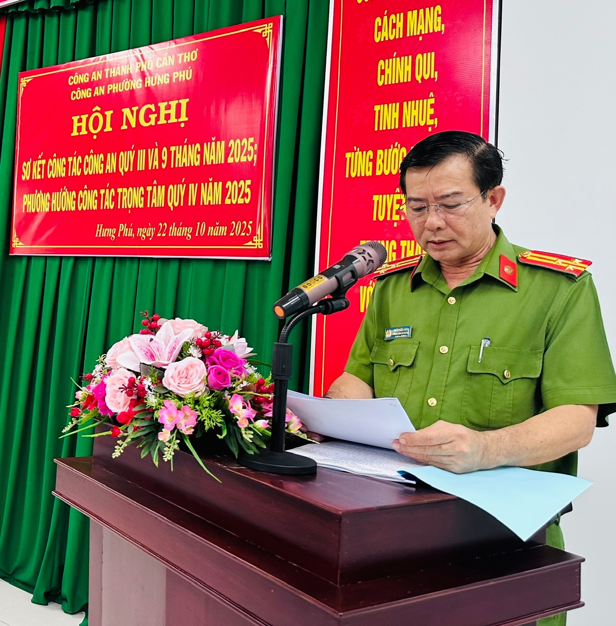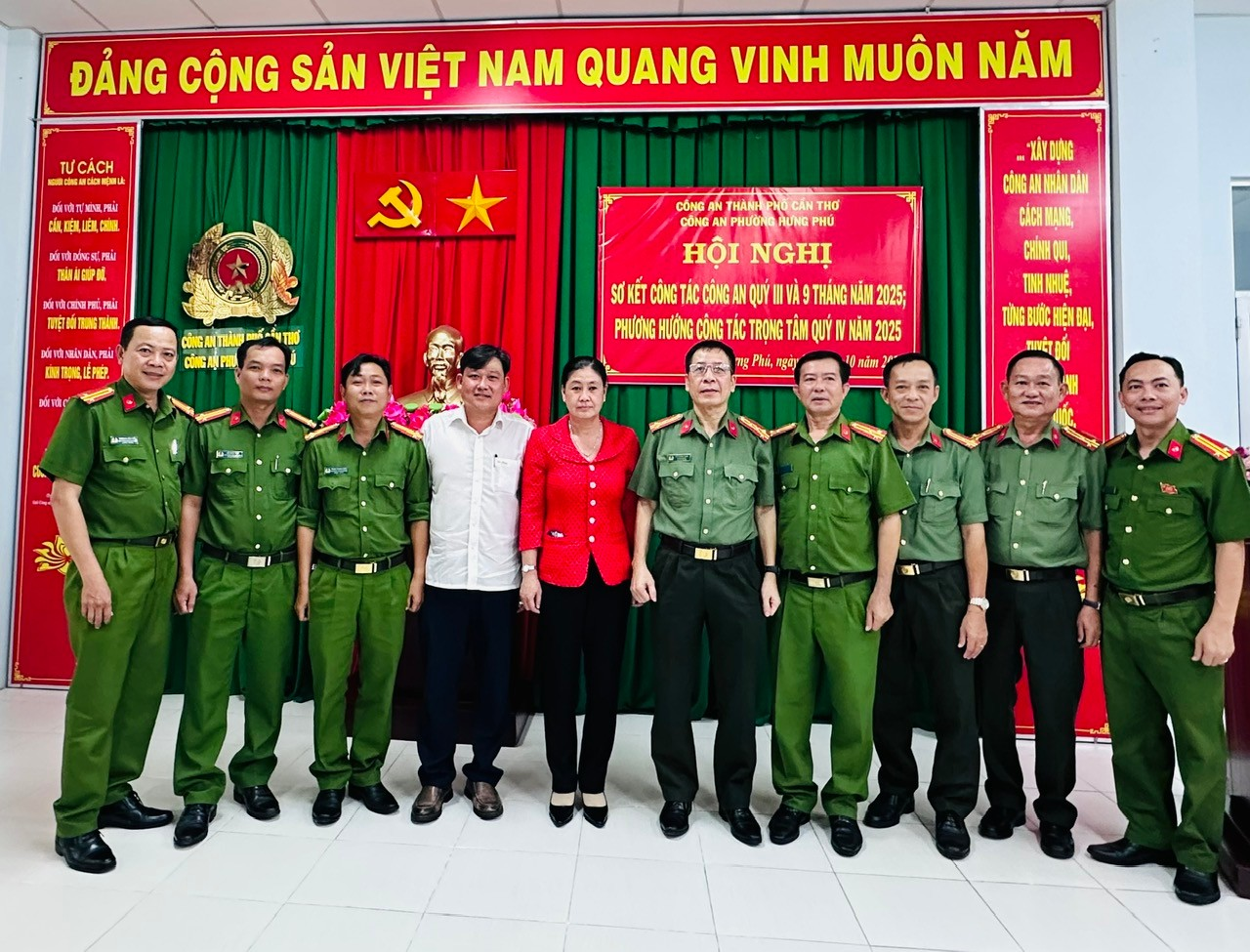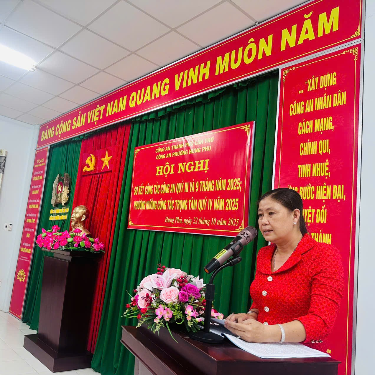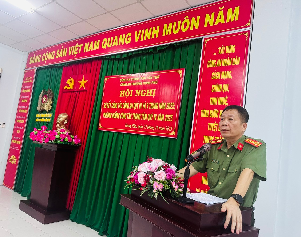 Dự và chỉ đạo Hội nghị có Đại tá Vũ Thành Thức, Ủy viên Ban Thường vụ Đảng ủy, Phó Giám đốc Công an thành phố. Về cấp phường, có đồng chí Huỳnh Hiếu Trực, Phó Bí thư Thường trực Đảng ủy, Chủ tịch Hội đồng nhân dân phường và đồng chí Nguyễn Thị Trúc Linh, Phó Bí thư Đảng ủy, Chủ tịch Ủy ban nhân dân phường Hưng Phú. Thời gian qua, Công an phường Hưng Phú đã triển khai quyết liệt và đạt hiệu quả 17 cao điểm tấn công, trấn áp các loại tội phạm và tệ nạn xã hội. Đồng thời, đơn vị chủ động triển khai đồng bộ nhiều biện pháp nghiệp vụ và phòng ngừa xã hội, tăng cường tuần tra kiểm soát, khép kín địa bàn, quản lý chặt chẽ các loại đối tượng, bảo vệ an toàn các ngày Lễ, Tết, cũng như các sự kiện quan trọng của đất nước; đảm bảo tuyệt đối an toàn cho các đoàn đại biểu đến thăm và làm việc trên địa bàn; kịp thời giải quyết các tình hình nổi lên ở cơ sở, không để hình thành điểm nóng hoặc bị động bất ngờ. Nhờ đó, tình hình tội phạm trên địa bàn giảm, góp phần giữ gìn an ninh, trật tự tại địa phương. Trong 9 tháng qua, Công an phường đã điều tra, khám phá 43/51 vụ phạm pháp, đạt tỷ lệ 84,31%, vượt chỉ tiêu được giao. Đơn vị đã triệt phá 9 điểm với 12 đối tượng có hành vi tàng trữ, tổ chức, sử dụng trái phép chất ma túy; 14 điểm cờ bạc, bắt và xử lý 57 đối tượng. Các tin tố giác, tin báo tội phạm đều được giải quyết kịp thời, không để tồn đọng kéo dài, đảm bảo an ninh trật tự trên địa bàn. Ngoài ra, Công an phường đã tăng cường tuần tra, kiểm soát giao thông đường bộ, lập lại trật tự đô thị và trật tự công cộng trên 1.700 cuộc tuần tra, hơn 8.000 lượt cán bộ, chiến sĩ tham gia. Qua đó, nhắc nhở khoảng 2.500 trường hợp buôn bán, lấn chiếm vỉa hè và lòng đường; lập biên bản xử lý vi phạm hành chính hơn 80 trường hợp với tổng số tiền phạt trên 45 triệu đồng. Nhờ các biện pháp đồng bộ, tình hình tội phạm trên địa bàn giảm, trật tự xã hội được giữ vững. Đồng thời, tai nạn giao thông giảm 06 vụ so với cùng kỳ.