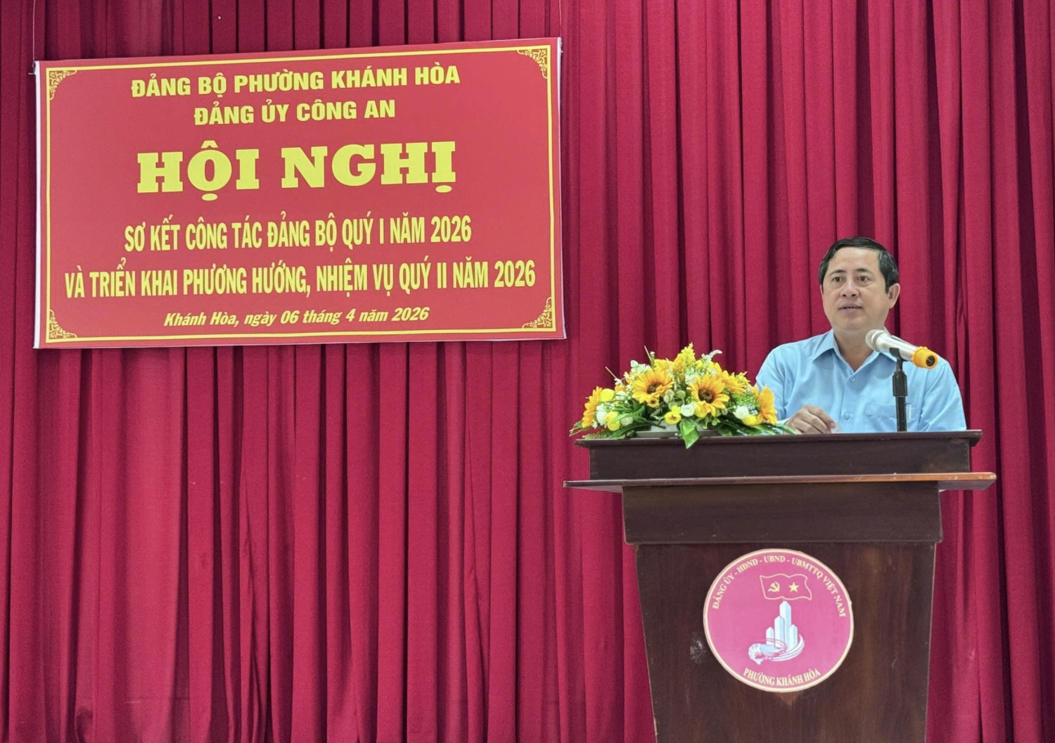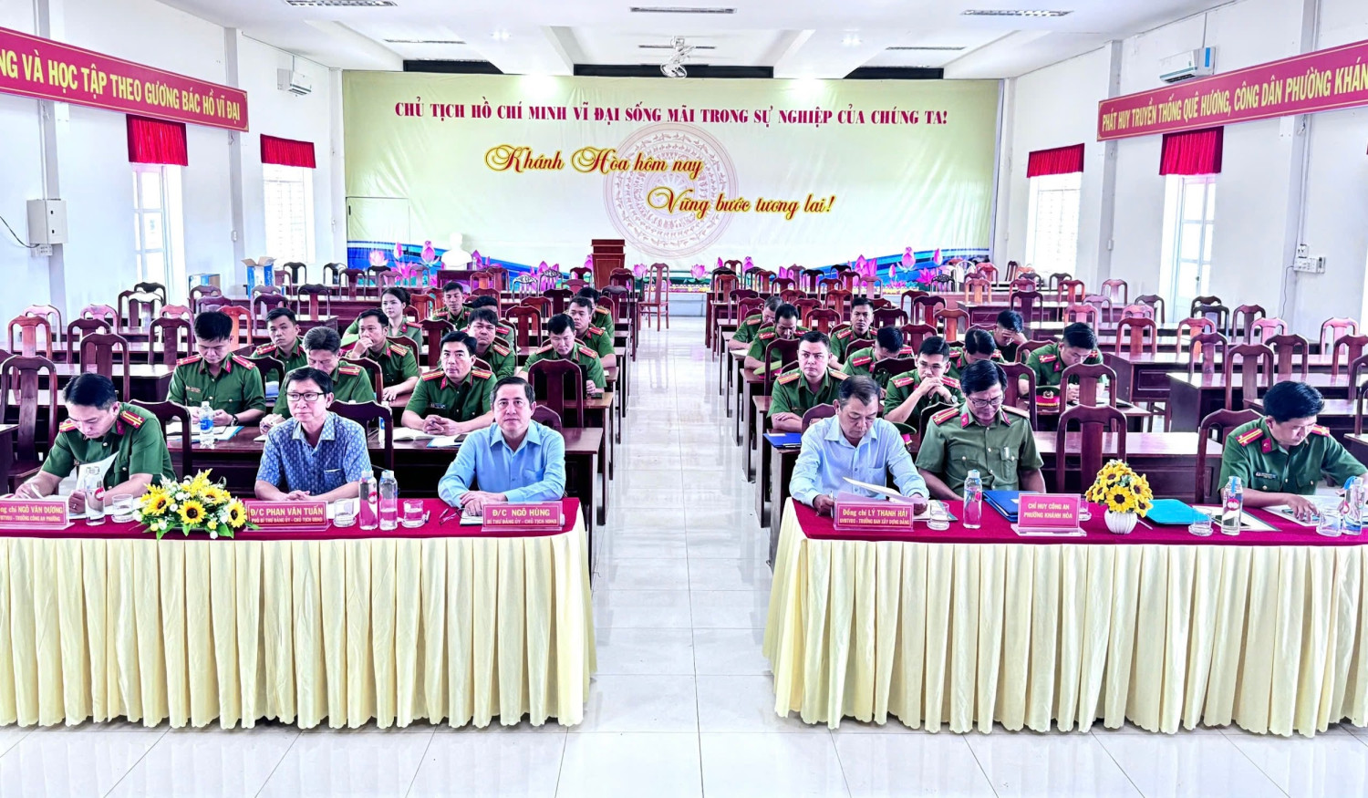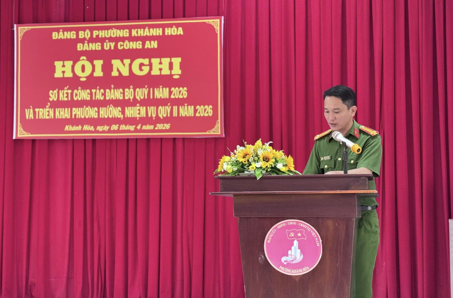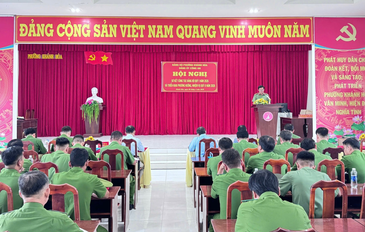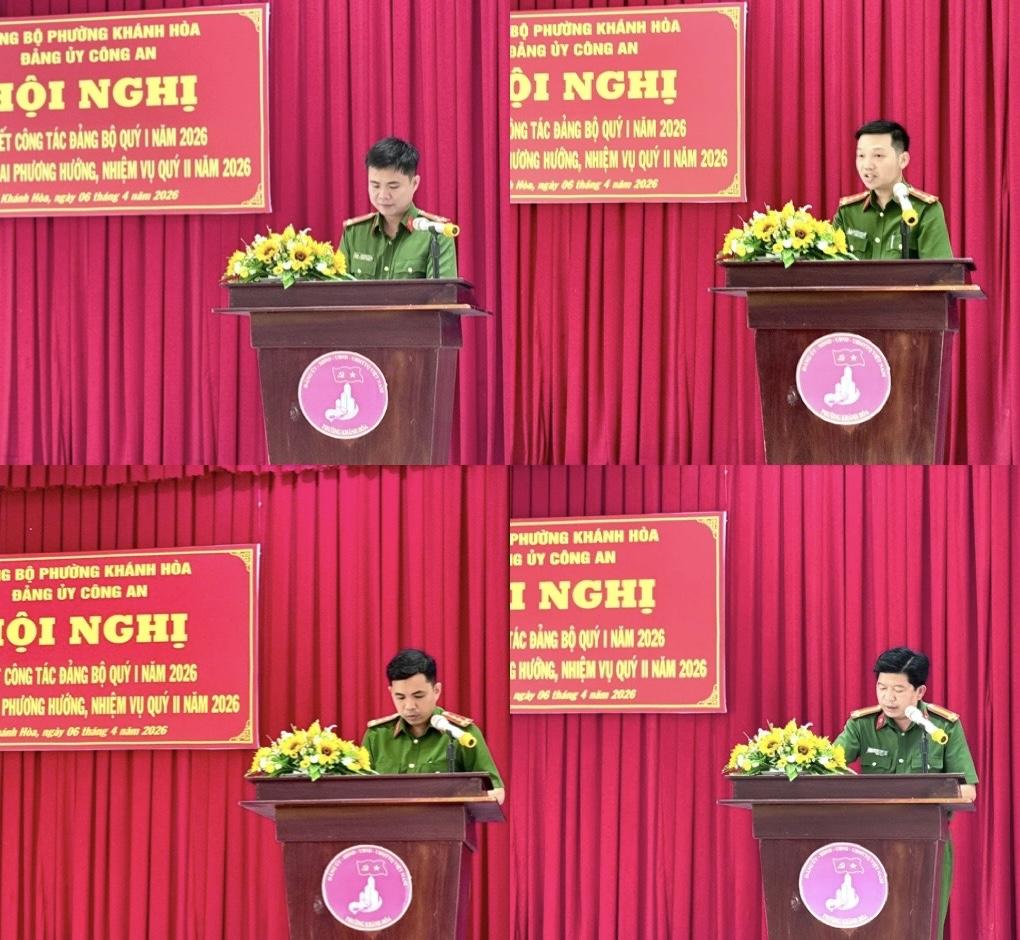 Chiều ngày 06/4/2026 Đảng ủy Công an phường Khánh Hòa tổ chức Hội nghị sơ kết công tác Đảng bộ quý I và triển khai phương hướng, nhiệm vụ quý II năm 2026. Dự và chỉ đạo hội nghị có các đồng chí Ngô Hùng - Bí thư Đảng ủy, Chủ tịch Hội đồng nhân dân phường; Phan Văn Tuấn - Phó Bí thư Đảng ủy, Chủ tịch Ủy ban nhân dân phường. Trung tá Ngô Văn Dương - Bí thư Đảng ủy, Trưởng Công an phường chủ trì hội nghị. Tham dự hội nghị còn có các đồng chí trong Ban Chấp hành và toàn thể đảng viên của Đảng bộ Công an phường Khánh Hòa.