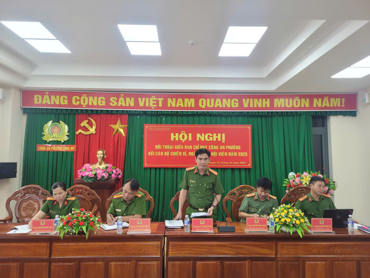 Ngày 21/10/2025, Công an phường Long Mỹ tổ chức Hội nghị đối thoại giữa Ban Chỉ huy Công an phường với cán bộ, chiến sĩ, đoàn viên, hội viên, thực hiện chỉ đạo của Đảng ủy và Ban Giám đốc Công an thành phố Cần Thơ về tăng cường công tác dân chủ ở cơ sở. Đồng chí Thượng tá Lê Hoàng Khải, Trưởng Công an phường chủ trì hội nghị cùng các đồng chí trong Ban Chỉ huy và toàn thể cán bộ, chiến sĩ, đoàn viên, hội viên tham dự. Hội nghị tạo điều kiện để cán bộ, chiến sĩ, đoàn viên, hội viên bày tỏ khó khăn, vướng mắc trong công tác chuyên môn và công tác đoàn, hội, kịp thời nắm bắt tâm tư, nguyện vọng, giải quyết các vấn đề liên quan đến công tác cán bộ, chế độ chính sách, góp phần duy trì đoàn kết nội bộ.