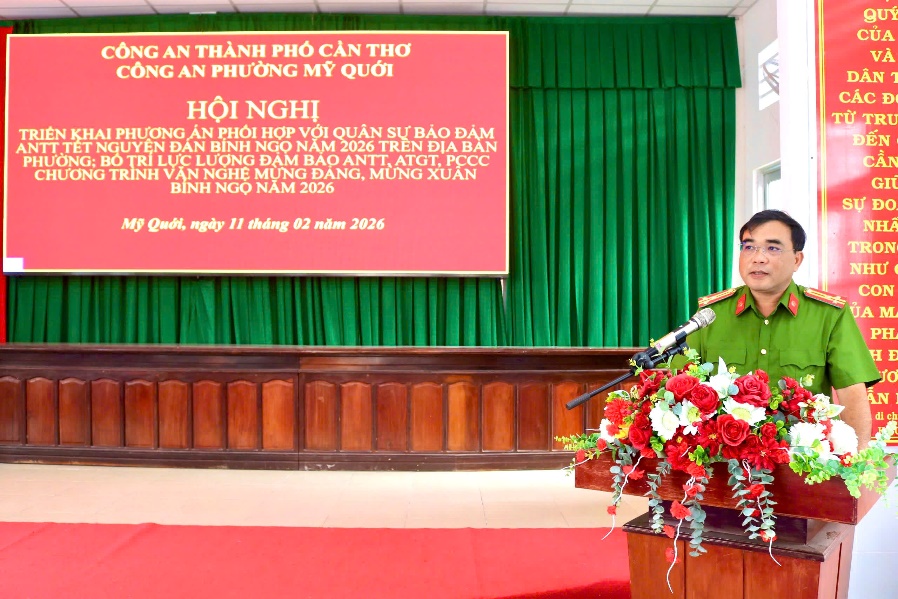 Nhằm chủ động bảo đảm an ninh, trật tự Tết Nguyên đán Bính Ngọ năm 2026 và các hoạt động mừng Đảng, mừng Xuân trên địa bàn, phục vụ Nhân dân vui Xuân, đón Tết an toàn, bình yên, ngày 11/02/2026, Công an phường Mỹ Quới tổ chức Hội nghị triển khai phương án phối hợp với Ban Chỉ huy Quân sự phường trong công tác bảo đảm an ninh, trật tự dịp Tết và phương án bố trí lực lượng bảo đảm an ninh, trật tự, an toàn giao thông, phòng cháy, chữa cháy Chương trình văn nghệ mừng Đảng, mừng Xuân Bính Ngọ năm 2026.