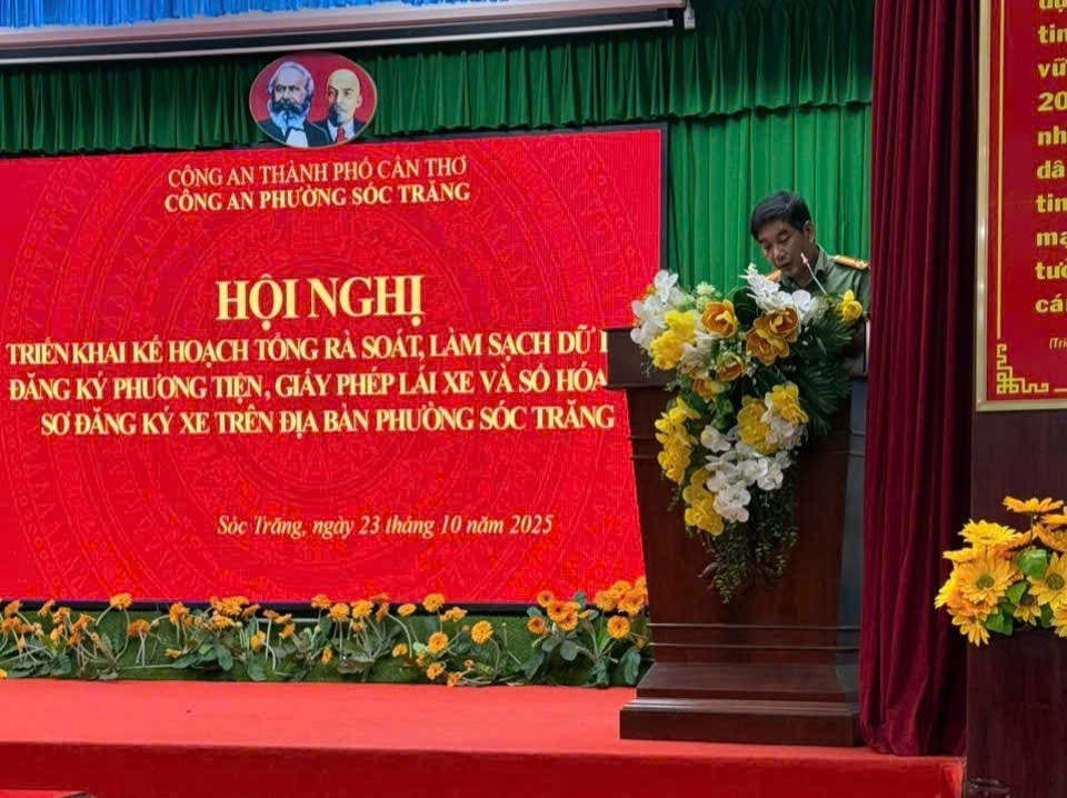 Ngày 23/10/2025, tại Hội trường Công an phường Sóc Trăng, Công an phường đã tổ chức Hội nghị triển khai Kế hoạch tổng rà soát, làm sạch dữ liệu đăng ký phương tiện, giấy phép lái xe và số hóa hồ sơ đăng ký xe trên địa bàn phường. Hội nghị có sự tham dự của lãnh đạo các ban, ngành, đoàn thể phường, Cảnh sát khu vực và trưởng 24 khu vực.