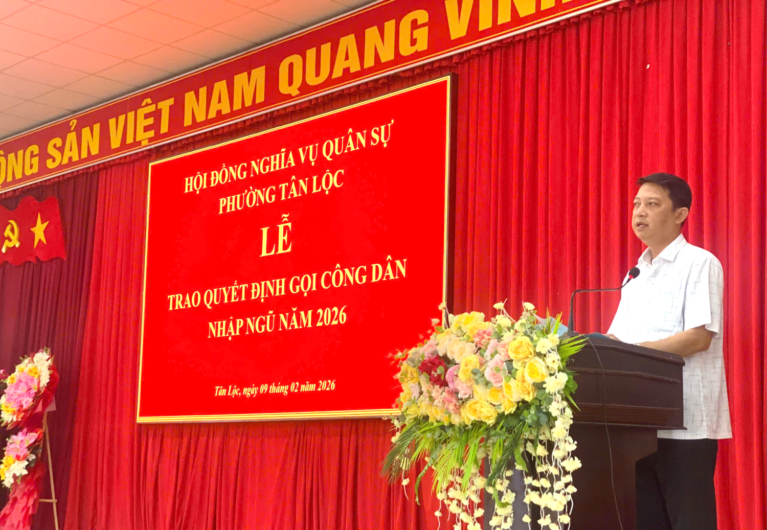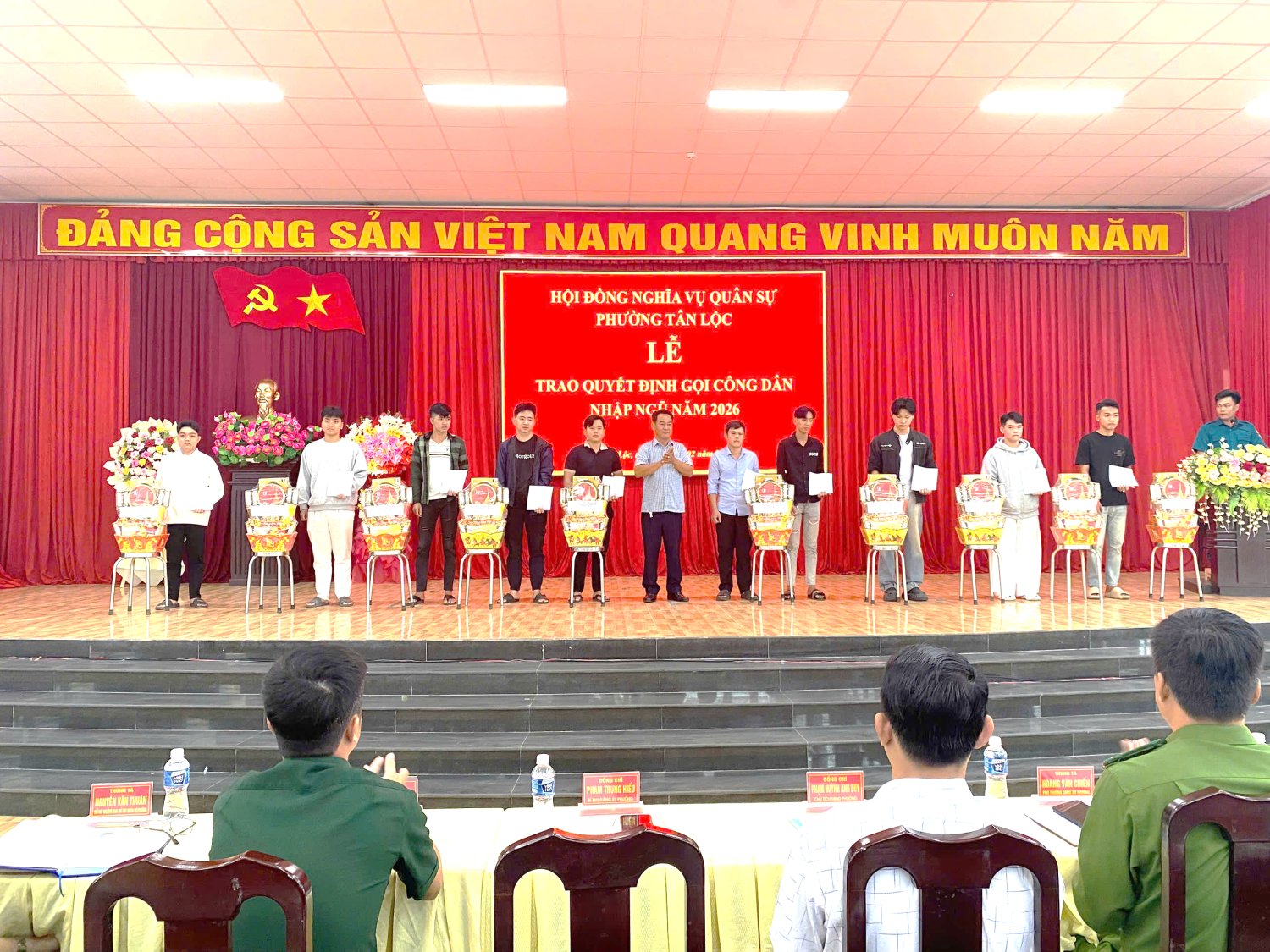 Trong không khí trang nghiêm, phấn khởi của những ngày đầu năm mới, ngày 09/02/2026, tại Hội trường Ủy ban nhân dân phường Tân Lộc, Hội đồng Nghĩa vụ quân sự phường Tân Lộc, thành phố Cần Thơ long trọng tổ chức Lễ trao Quyết định gọi công dân nhập ngũ năm 2026 cho các thanh niên trúng tuyển nghĩa vụ quân sự và nghĩa vụ tham gia Công an nhân dân trên địa bàn.