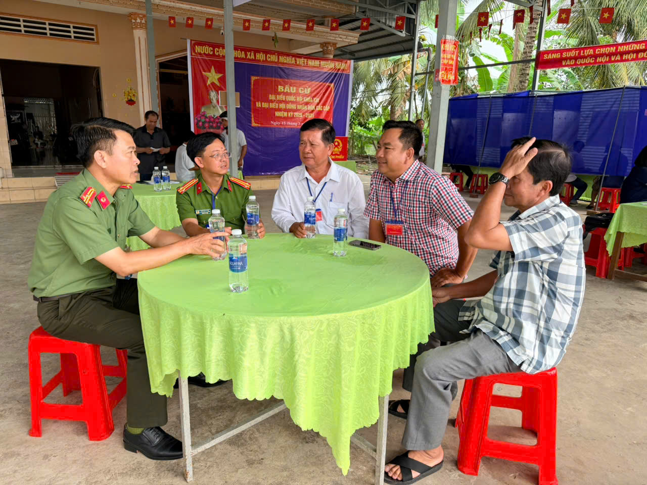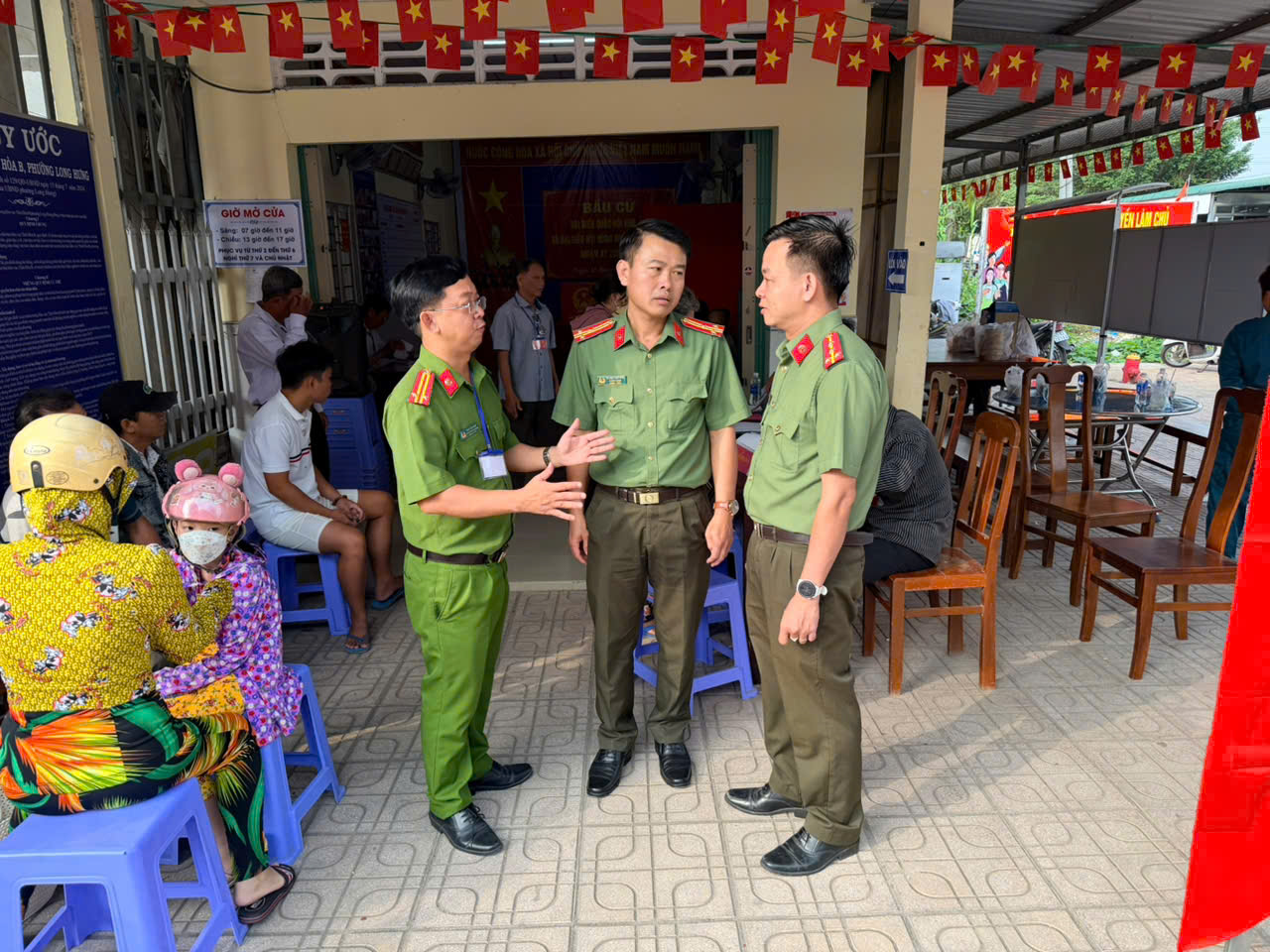 Hình ảnh đồng chí Thượng tá Trương Văn Cảnh, Trưởng phòng Hồ sơ nghiệp vụ, Ban chỉ huy trực tiếp kiểm tra, chỉ đạo công tác đảm bảo ANTT tại các điểm bầu cử.