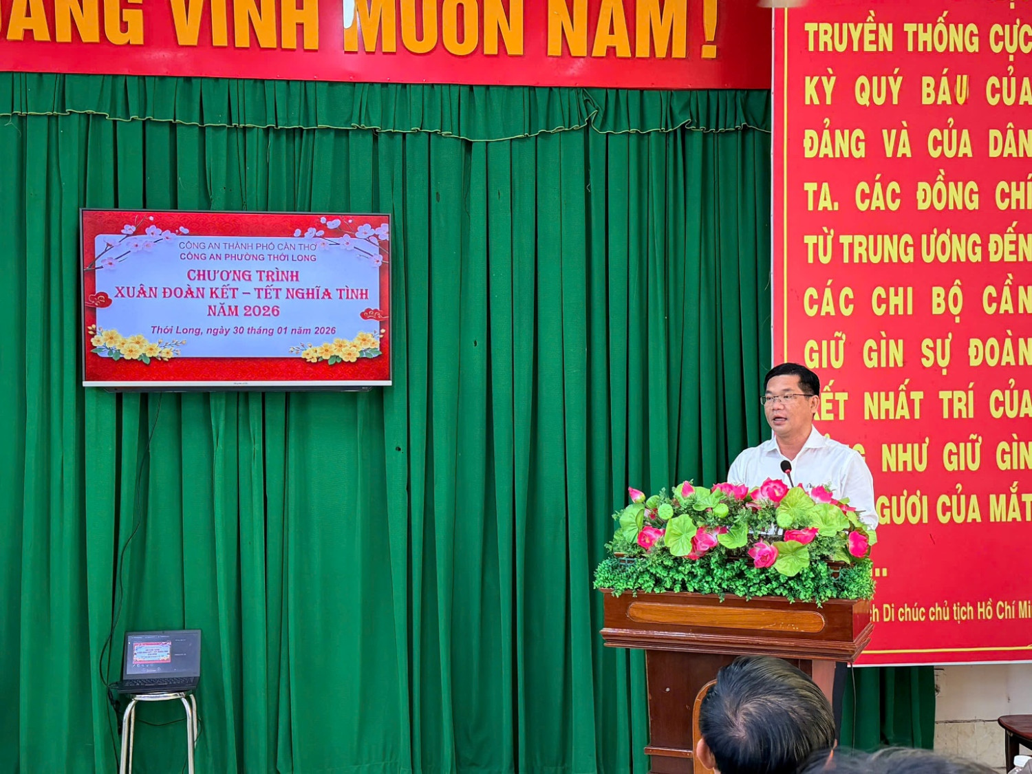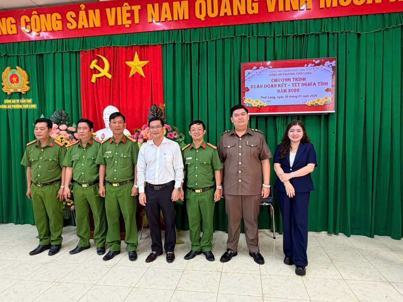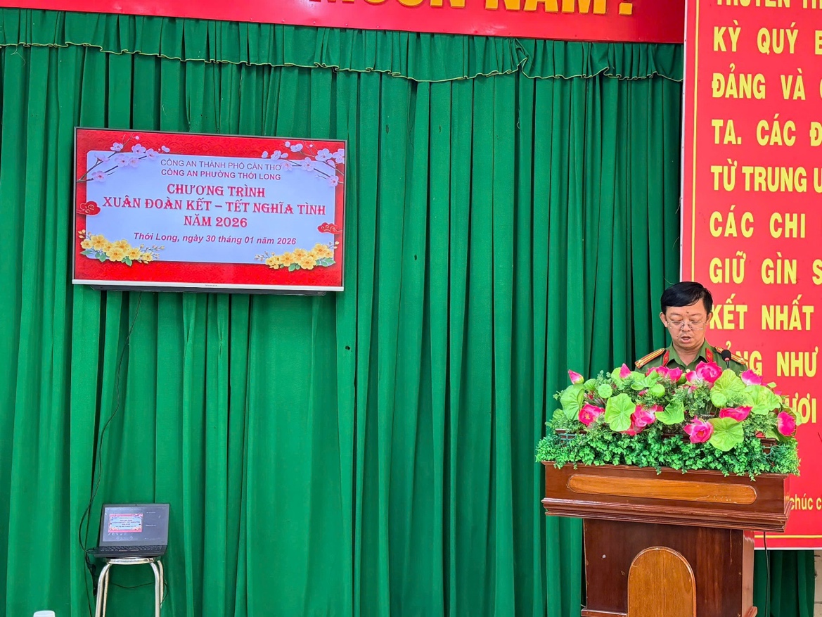 Ngày 30/01/2026, trong không khí những ngày giáp Tết Nguyên đán, Công an phường Thới Long tổ chức Chương trình “Xuân đoàn kết – Tết nghĩa tình” năm 2026 nhằm động viên, chăm lo đời sống vật chất, tinh thần cho lực lượng tham gia bảo vệ an ninh, trật tự ở cơ sở. Tham dự Chương trình có đồng chí Nguyễn Thanh Nhanh, Phó Bí thư Đảng ủy, Chủ tịch Ủy ban nhân dân phường; Ban Chỉ huy Công an phường, cán bộ Công an phường, lực lượng tham gia bảo vệ an ninh, trật tự ở cơ sở và các đơn vị tài trợ.