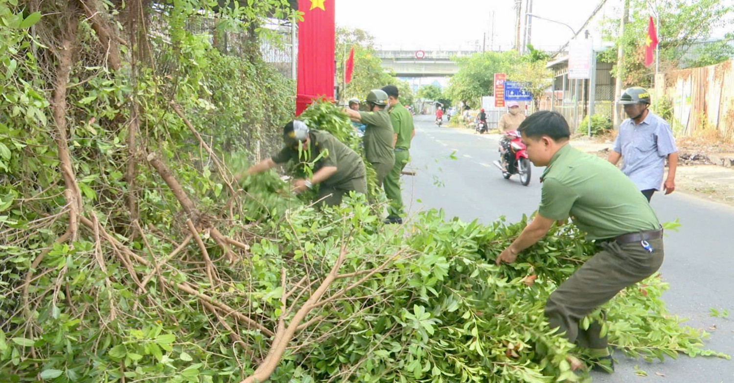 Đoàn viên thanh niên Công an phường Trung Nhứt phát quang bụi rậm trên tuyến đường tỉnh lộ 921 thuộc khu vực Tràng Thọ A