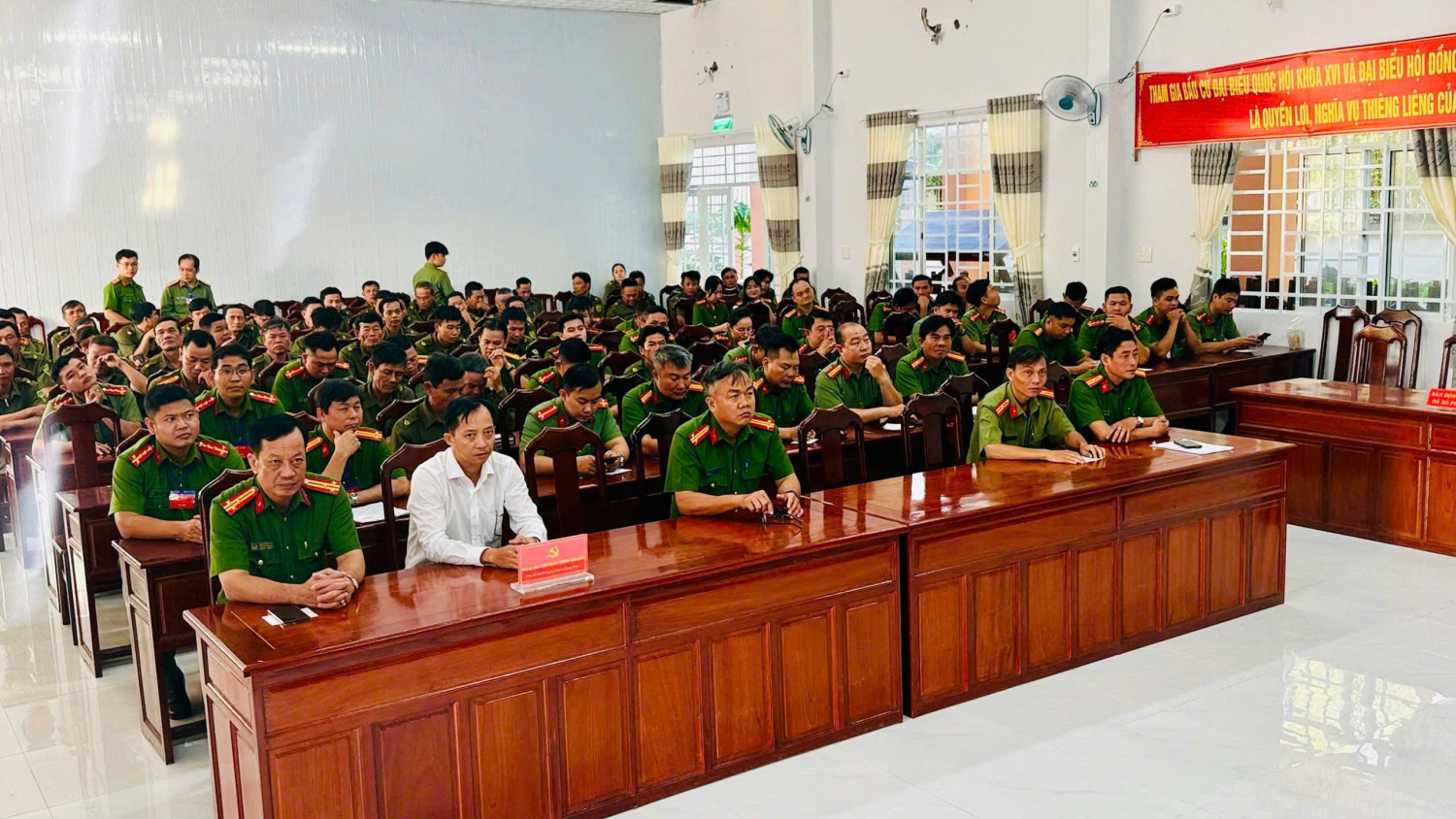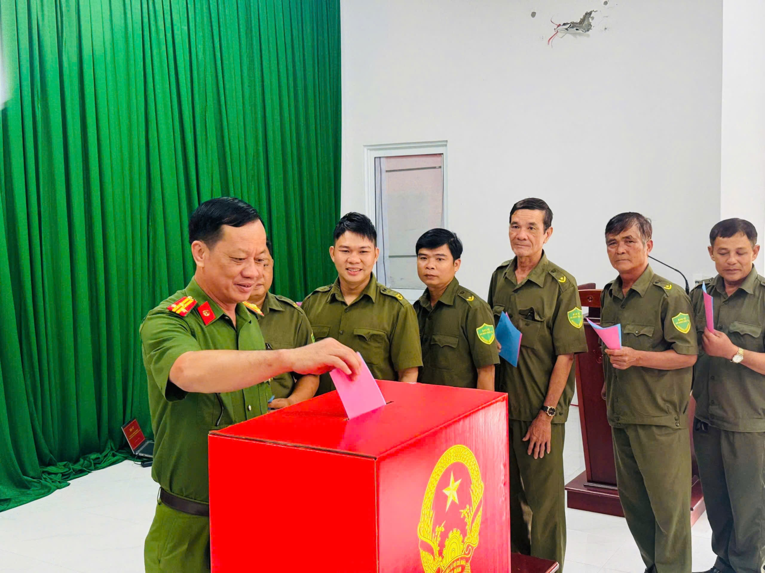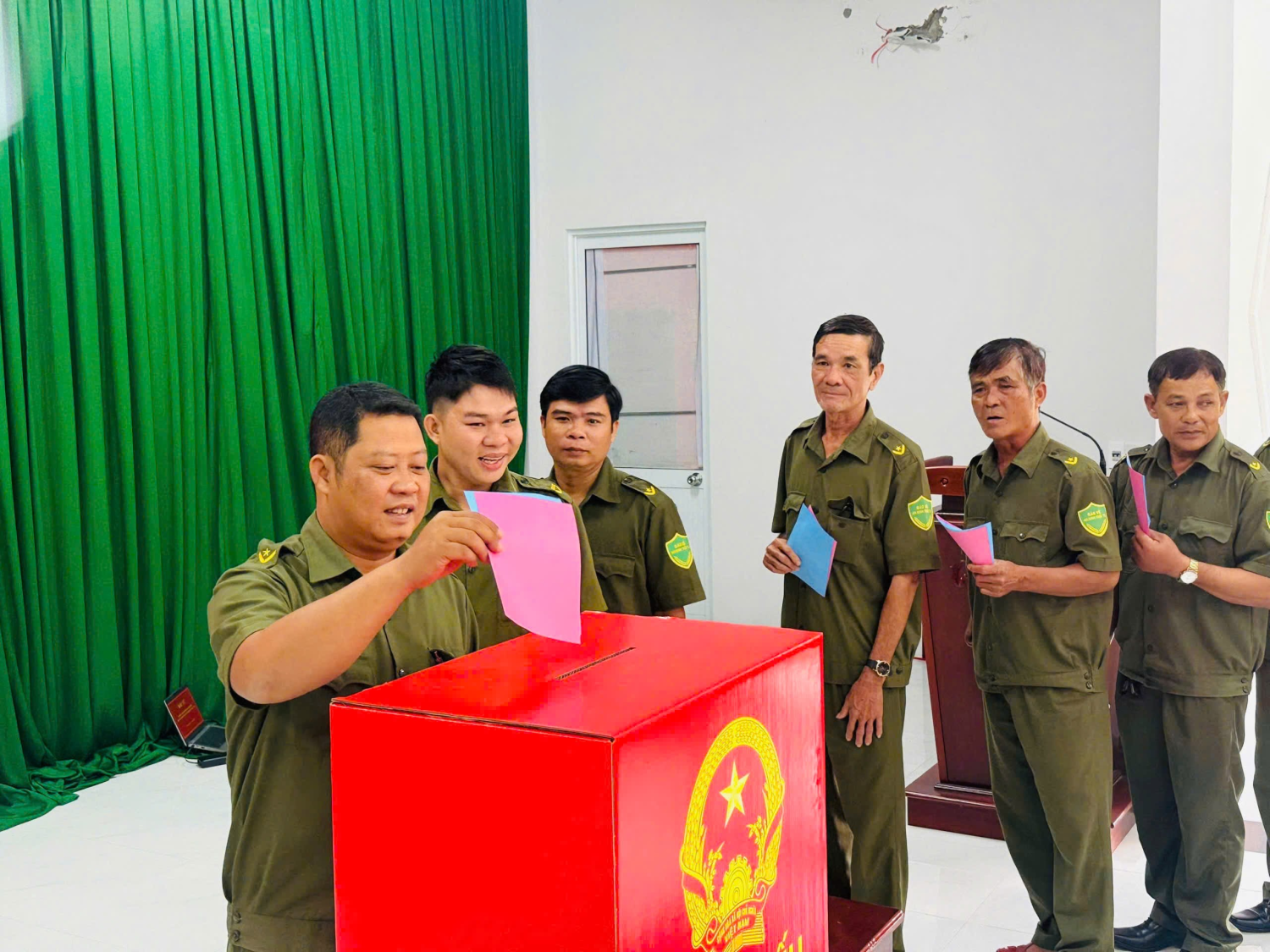 Từ sáng sớm, không khí tại khu vực bỏ phiếu diễn ra nghiêm túc, trang trọng và đúng quy định. Các cử tri trong lực lượng Công an và Lực lượng bảo vệ an ninh, trật tự cơ sở với trang phục chỉnh tề đã lần lượt thực hiện các bước kiểm tra thông tin, nhận phiếu và bỏ phiếu theo đúng quy trình. Công tác tổ chức được chuẩn bị chu đáo, bảo đảm nhanh gọn, thuận lợi nhưng vẫn trang nghiêm, đúng quy định của pháp luật.