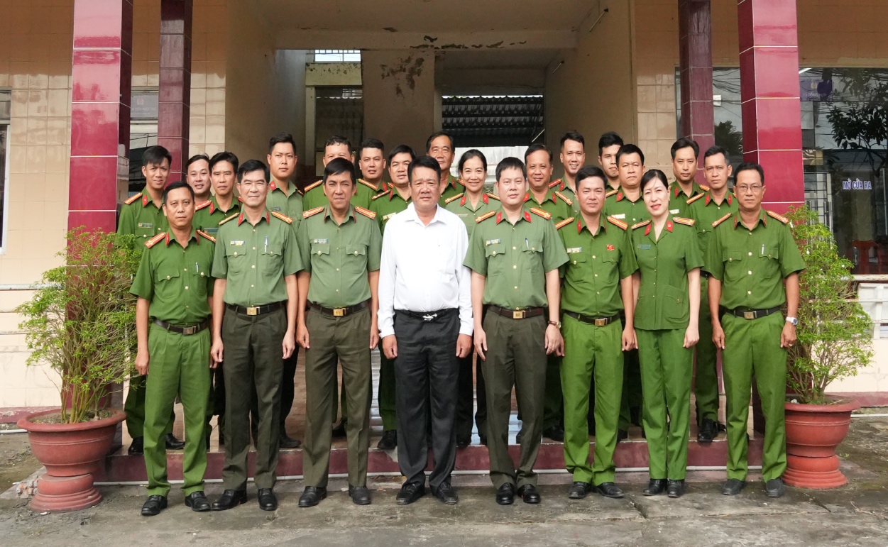 Tập thể Công an xã Thạnh Hòa chụp ảnh lưu niệm cùng các đồng chí lãnh đạo