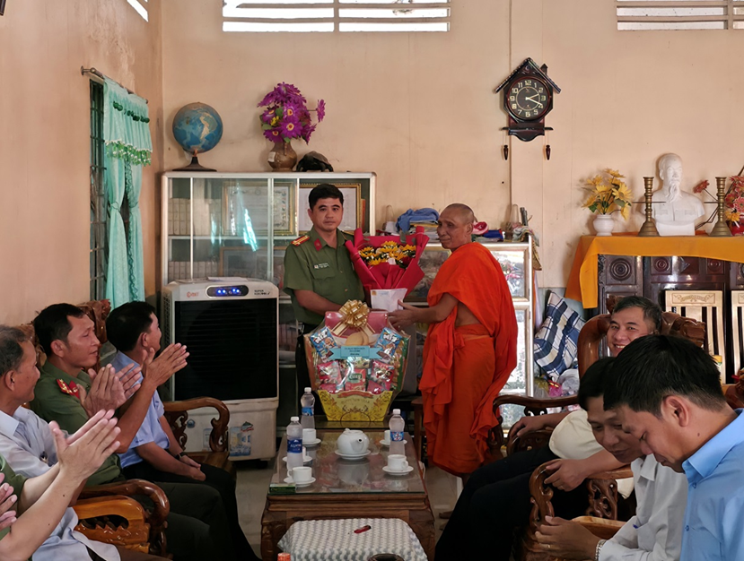 Tại buổi gặp mặt, đồng chí Trung tá Phạm Phú Đông, Phó Trưởng Công an xã đã ân cần thăm hỏi, tặng quà và gửi lời chúc mừng tốt đẹp đến Hoà thượng Dương An; đồng thời ghi nhận những đóng góp tích cực của Hoà thượng trong công tác hoằng pháp, xây dựng khối đại đoàn kết toàn dân tộc; tuyên truyền, vận động đồng bào Phật giáo Nam tông Khmer chấp hành tốt chủ trương của Đảng, chính sách, pháp luật của Nhà nước, tích cực tham gia phong trào “Toàn dân bảo vệ an ninh Tổ quốc”, góp phần giữ gìn an ninh, trật tự tại địa phương.