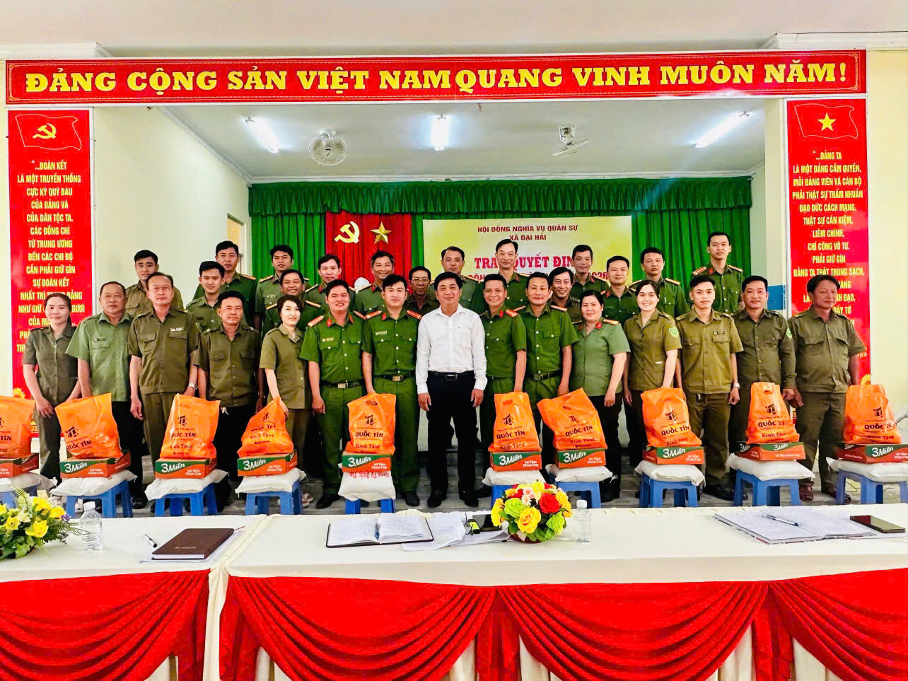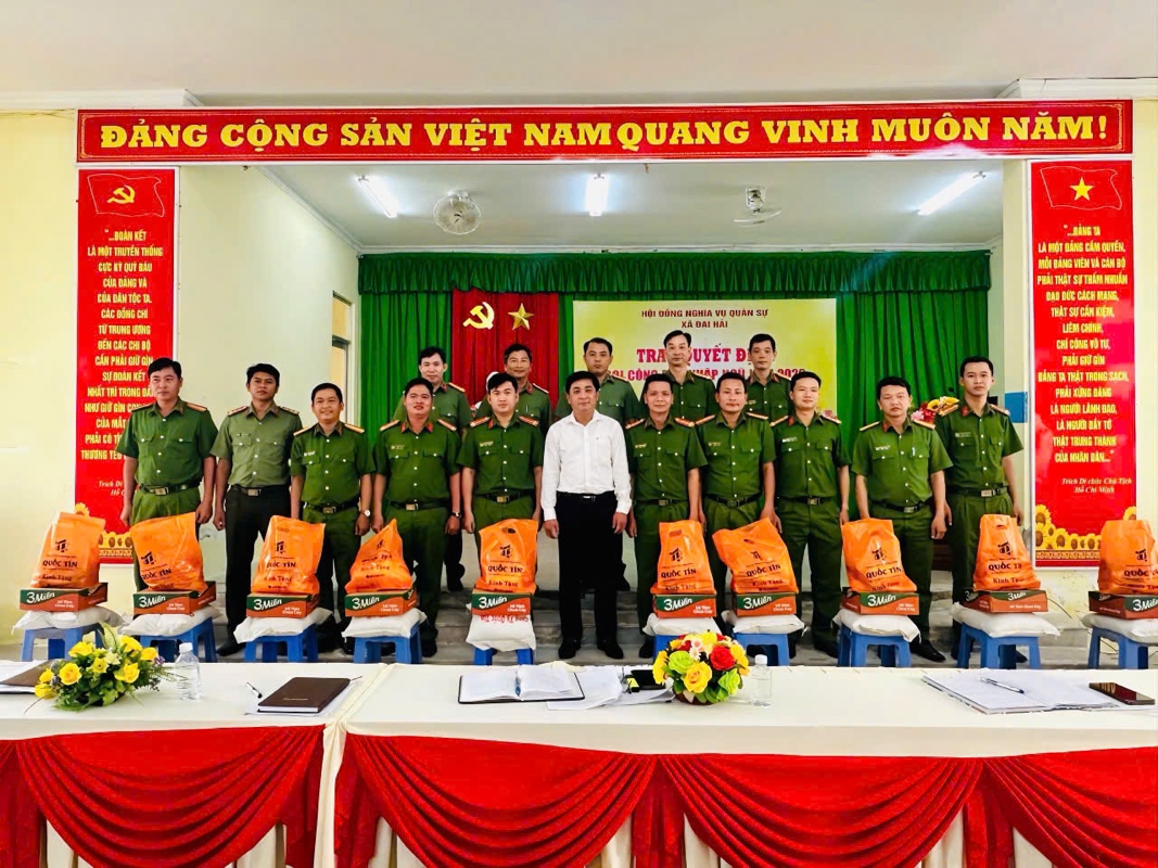 Đồng chí Dương Chí Nguyện, Chủ tịch Ủy ban nhân dân xã Đại Hải tặng quà, động viên lực lượng tham gia bảo vệ an ninh, trật tự ở cơ sở, ghi nhận những đóng góp trong công tác giữ gìn an ninh, trật tự trên địa bàn.