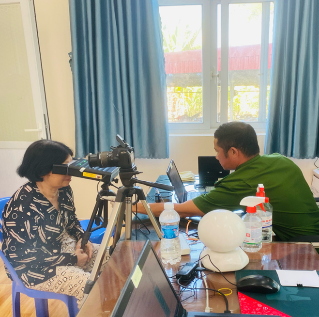Cán bộ Công an xã Đông Phước hướng dẫn công dân thực hiện thu nhận sinh trắc học