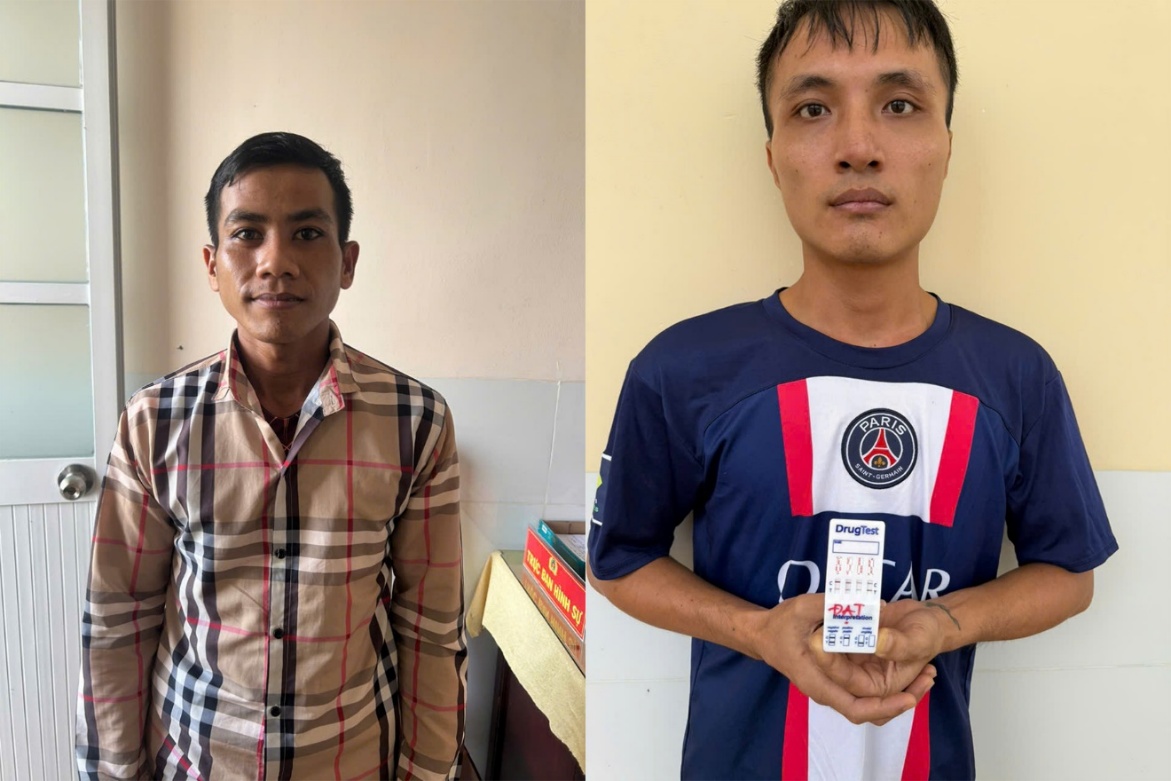 Hai đối tượng Huỳnh Vũ Tuấn và Trần Công Đạt (phải) tại Công an xã Hồ Đắc Kiện