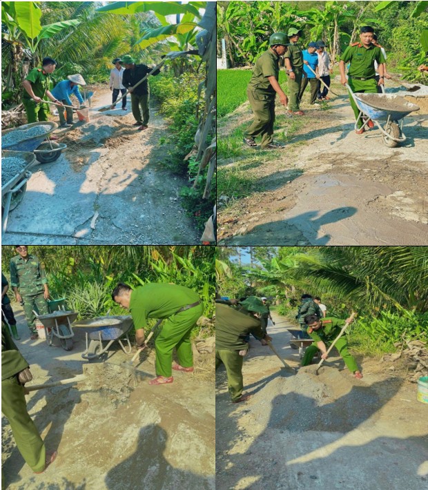 Ảnh Công an xã Hỏa Lựu hăng hái, nhiệt tình tham gia cùng Ban, ngành đoàn thể ấp hỗ trợ vá đường tại ấp Thạnh Hòa 2, xã Hỏa Lựu.