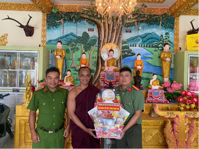 Trong không khí thân tình, ấm áp, đại diện các vị chức sắc, chức việc và người có uy tín trong đồng bào dân tộc Khmer bày tỏ niềm vui mừng, phấn khởi trước sự quan tâm của lãnh đạo Công an xã và khẳng định sẽ tiếp tục phát huy vai trò, uy tín của mình trong việc vận động đồng bào Phật tử sống “tốt đời, đẹp đạo”, chấp hành tốt chủ trương của Đảng, chính sách, pháp luật của Nhà nước; luôn đồng hành cùng chính quyền địa phương, vun đắp, chăm lo gắn kết tinh thần đoàn kết dân tộc, tôn giáo, góp phần thực hiện tốt chính sách dân tộc, tôn giáo của Đảng, Nhà nước.