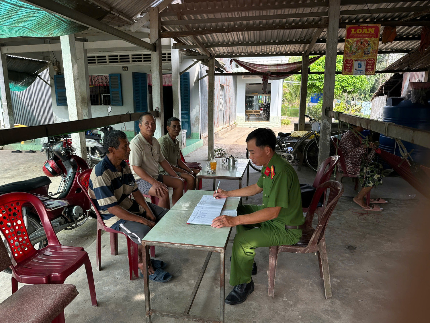 Lực lượng tham gia bảo vệ an ninh, trật tự ở cơ sở hỗ trợ người dân vùng đồng bào Khmer thực hiện các thủ tục cư trú.
