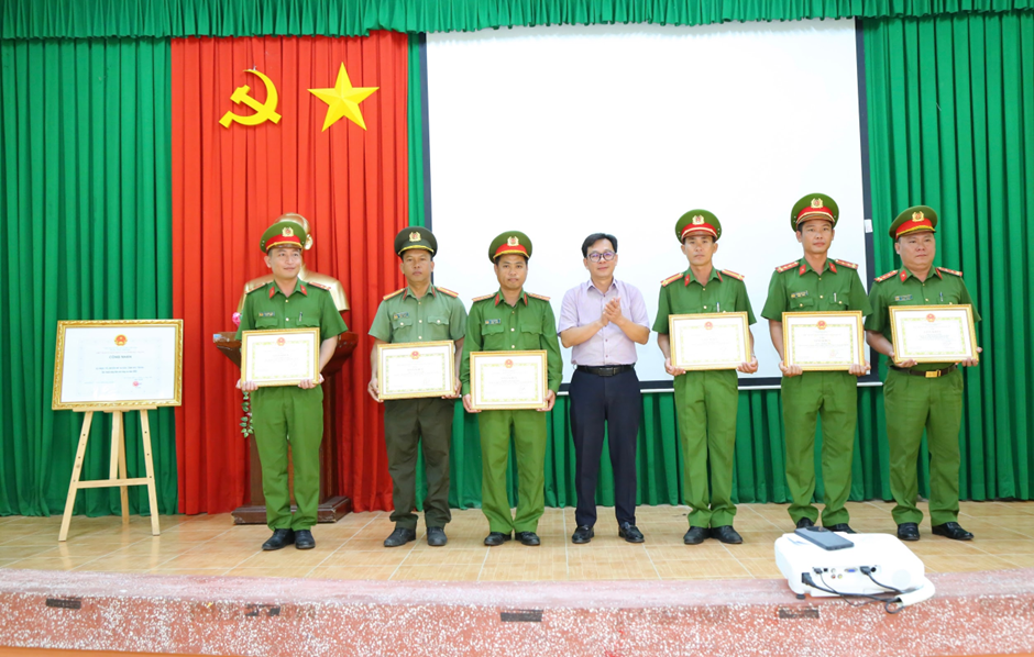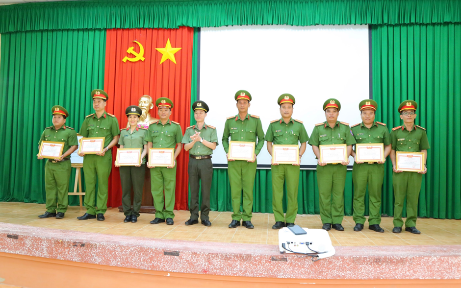 Đại tá Nguyễn Thanh Bình, Phó Giám đốc Công an thành phố trao danh hiệu “Đơn vị quyết thắng” và “Chiến sĩ thi đua cơ sở” cho tập thể và các cá nhân