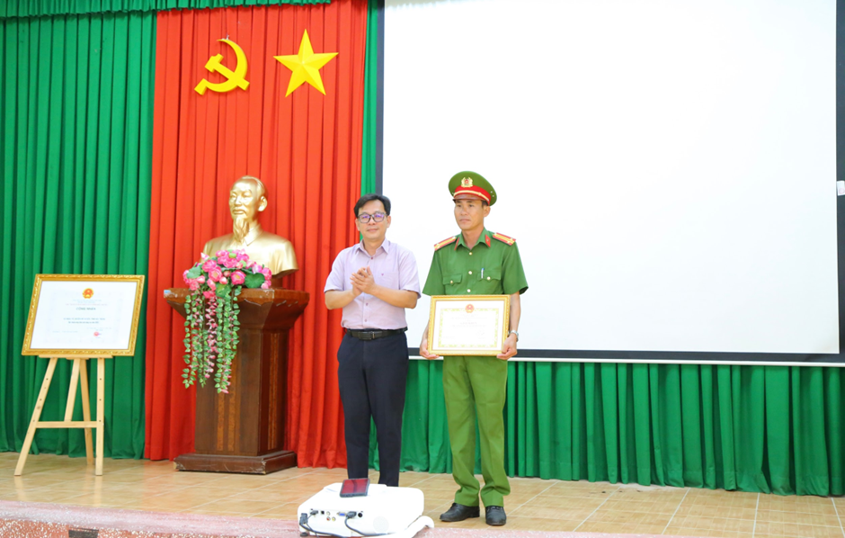 Đồng chí Nguyễn Minh Trí, Chủ tịch Ủy ban nhân dân xã trao giấy khen cho tập thể và cá nhân có thành tích xuất sắc trong công tác