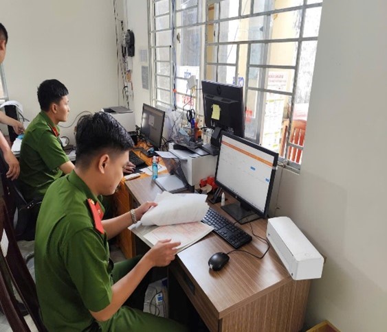 Cán bộ, chiến sĩ và đoàn viên, hội viên xung kích tham gia rà soát, nhập liệu dữ liệu phương tiện giao thông.