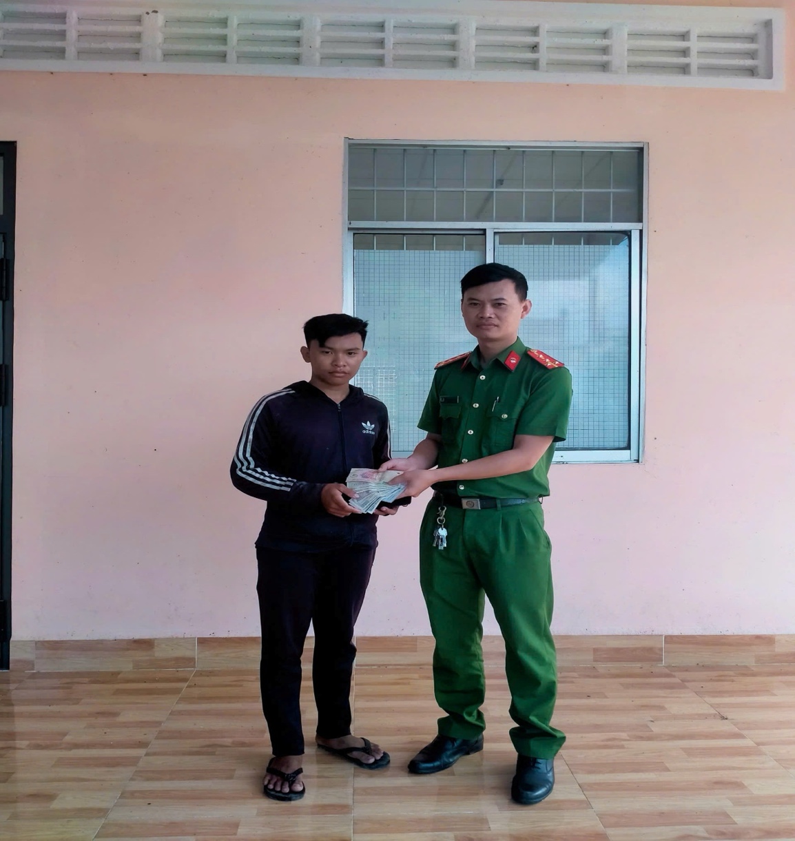 Cán bộ Công an xã Tân Phước Hưng trao lại giấy tờ và tiền cho người dân đánh rơi