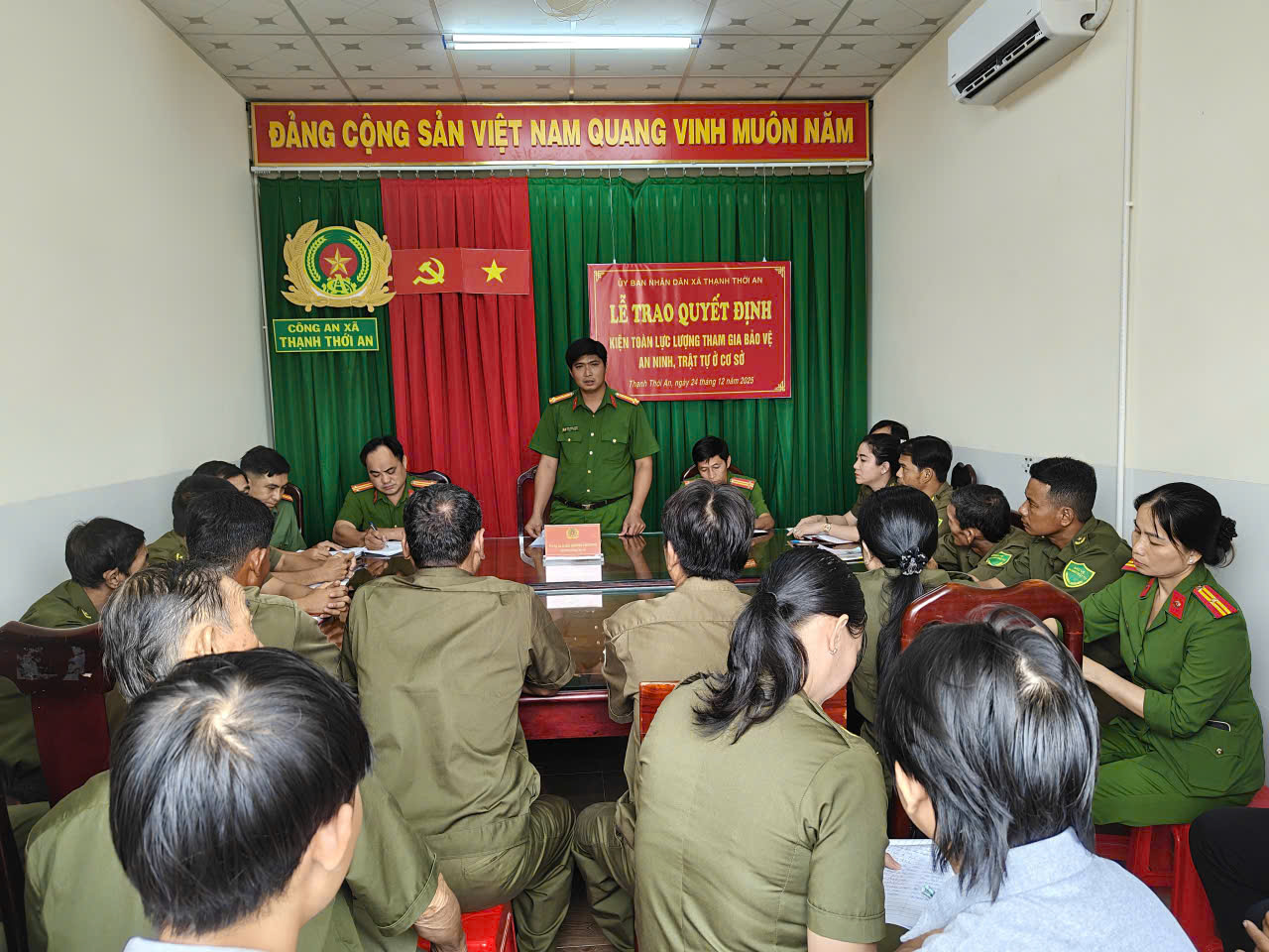 Quán triệt Nghị quyết số 34/2025/NQ-HĐND, ngày 10/12/2025 của Hội đồng nhân dân thành phố Cần Thơ quy định tiêu chí thành lập Tổ và số lượng thành viên Tổ bảo vệ an ninh, trật tự; mức hỗ trợ thường xuyên hằng tháng và mức hỗ trợ, bồi dưỡng khác đối với lực lượng tham gia bảo vệ an ninh, trật tự ở cơ sở trên địa bàn thành phố Cần Thơ, thực hiện chỉ đạo của Giám đốc Công an thành phố về việc thành lập, củng cố, kiện toàn lực lượng tham gia bảo vệ an ninh, trật tự ở cơ sở, Công an xã Thạnh Thới An đã chủ động triển khai thực hiện nghiêm túc các nội dung theo quy định