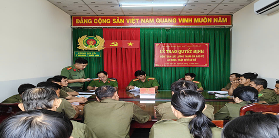 Ngày 24/12/2025, tại trụ sở Công an xã Thạnh Thới An, thành phố Cần Thơ, Công an xã tổ chức Lễ trao quyết định của Chủ tịch Ủy ban nhân dân xã về việc thành lập, công nhận, kiện toàn Tổ bảo vệ an ninh, trật tự tại các ấp trên địa bàn xã. Đồng chí Trung tá Châu Hoàng Khương, Ủy viên Ban Thường vụ Đảng ủy, Bí thư chi bộ, Trưởng Công an xã chủ trì buổi lễ. Tham dự buổi lễ có các đồng chí Phó Trưởng Công an xã, Tổ trưởng các Tổ thuộc Công an xã và toàn thể thành viên lực lượng tham gia bảo vệ an ninh, trật tự ở cơ sở. Tại buổi lễ, Ban Tổ chức đã công bố quyết định thành lập mới 01 Tổ bảo vệ an ninh, trật tự và kiện toàn 07 Tổ bảo vệ an ninh, trật tự. Đến nay, trên địa bàn xã Thạnh Thới An có tổng cộng 15 Tổ bảo vệ an ninh, trật tự với 45 thành viên.